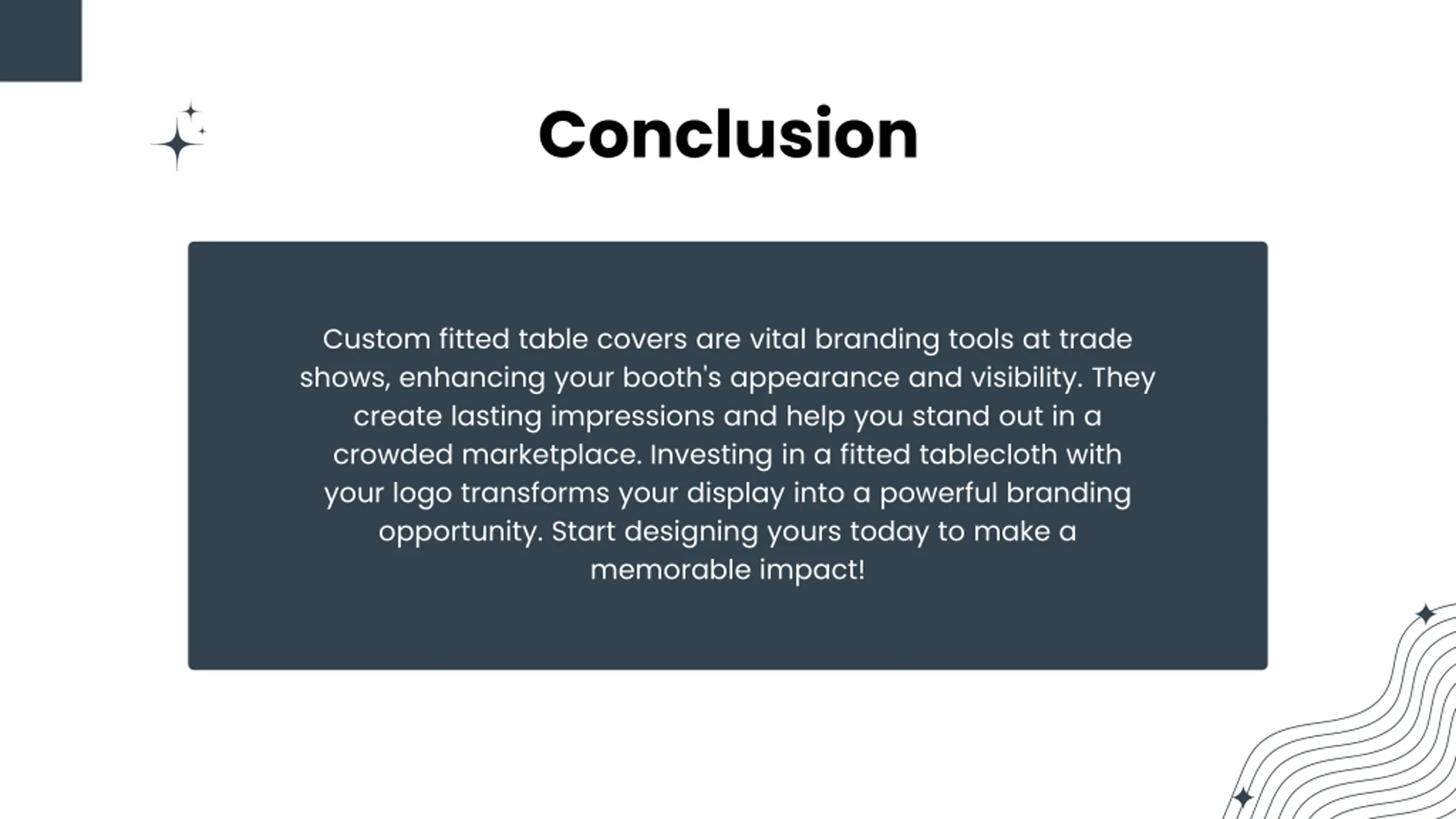 Conclusion Custom fitted table covers are vital branding tools at trade shows, enhancing your booth's appearance and visibility. They create lasting impressions and help you stand out in a crowded marketplace. Investing in a fitted tablecloth with your logo transforms your display into a powerful branding opportunity. Start designing yours today to make a memorable impact!
