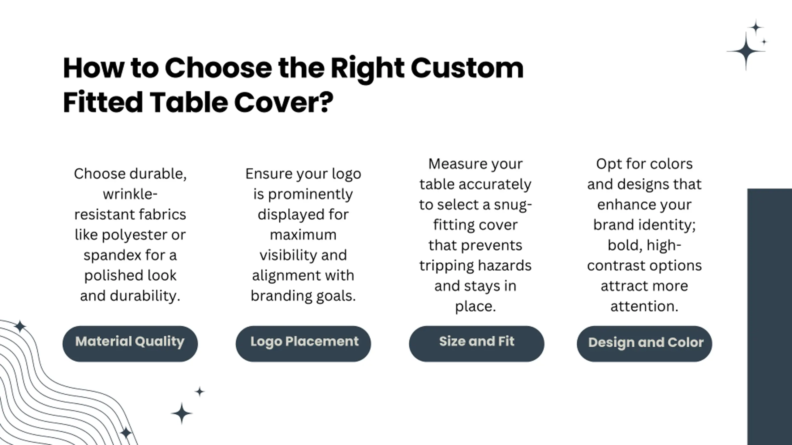 How to Choose the Right Custom Fitted Table Cover? Measure your table accurately to select a snug- fitting cover that prevents tripping hazards and stays in place. Opt for colors and designs that enhance your brand identity; bold, high- contrast options attract more attention. Choose durable, wrinkle- resistant fabrics like polyester or spandex for a polished look and durability. Ensure your logo is prominently displayed for maximum visibility and alignment with branding goals. Material Quality Logo Placement Size and Fit Design and Color