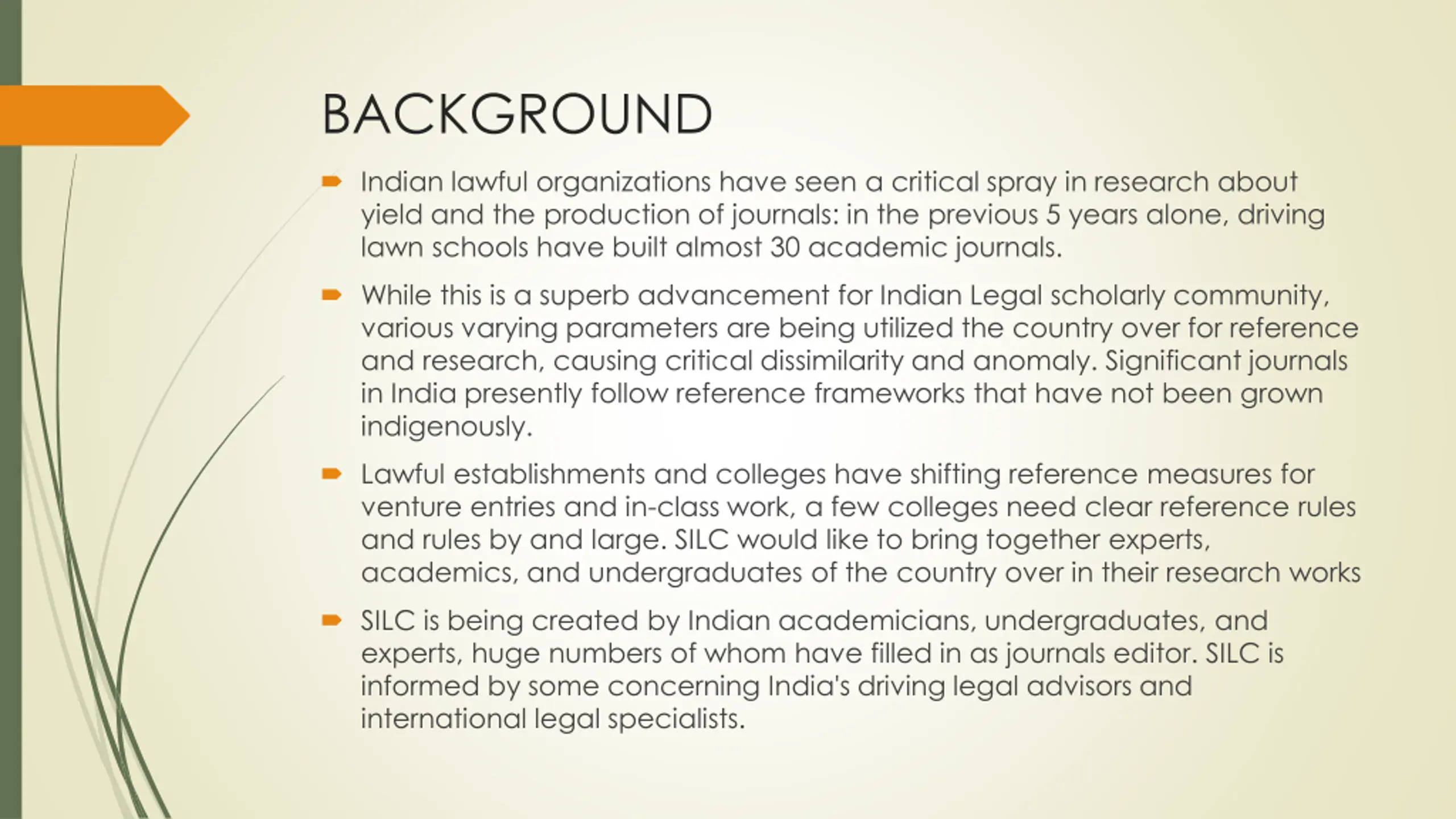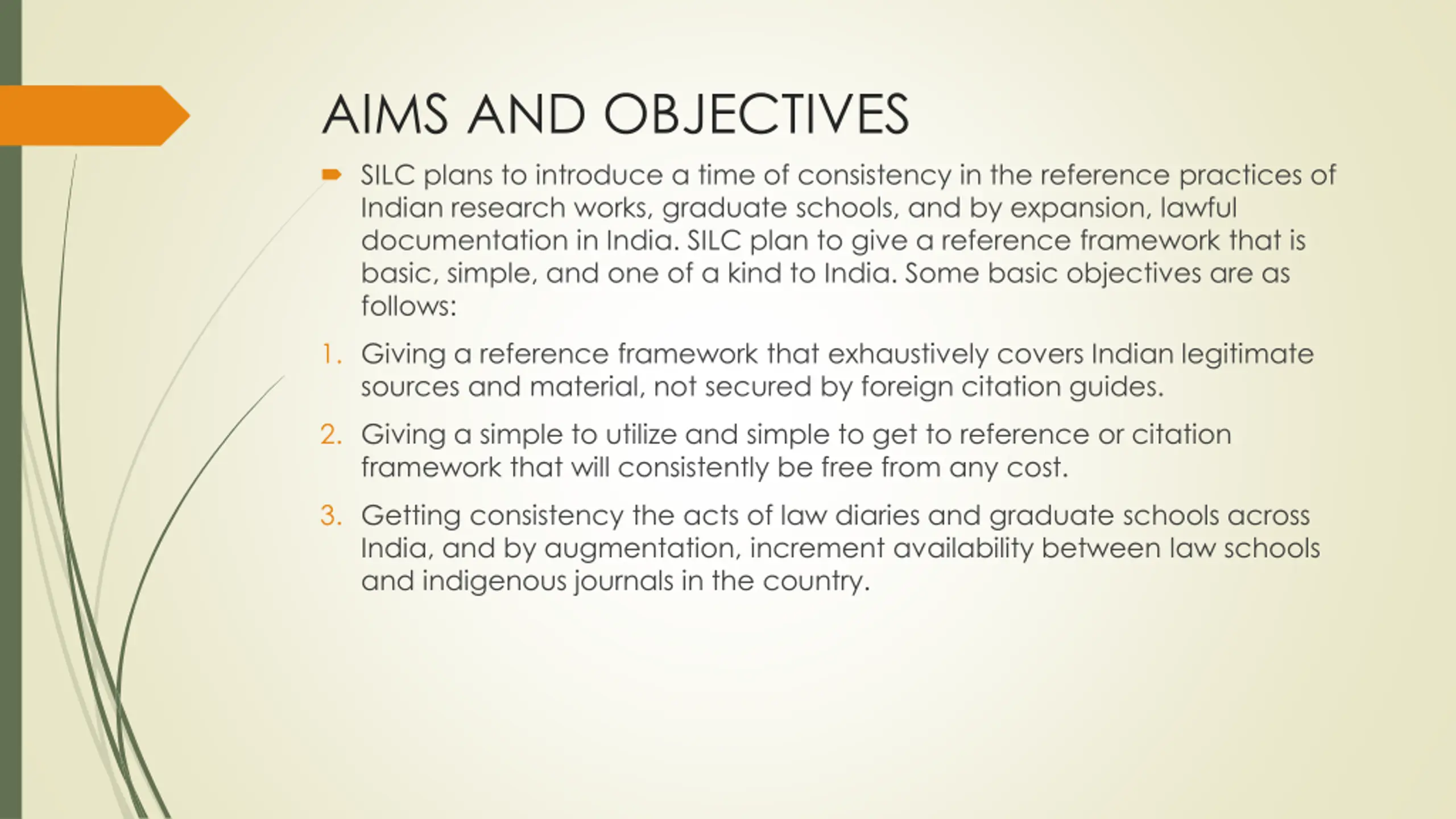AIMS AND OBJECTIVES SILC plans to introduce a time of consistency in the reference practices of Indian research works, graduate schools, and by expansion, lawful documentation in India. SILC plan to give a reference framework that is basic, simple, and one of a kind to India. Some basic objectives are as follows: 1. Giving a reference framework that exhaustively covers Indian legitimate sources and material, not secured by foreign citation guides. 2. Giving a simple to utilize and simple to get to reference or citation framework that will consistently be free from any cost. 3. Getting consistency the acts of law diaries and graduate schools across India, and by augmentation, increment availability between law schools and indigenous journals in the country.