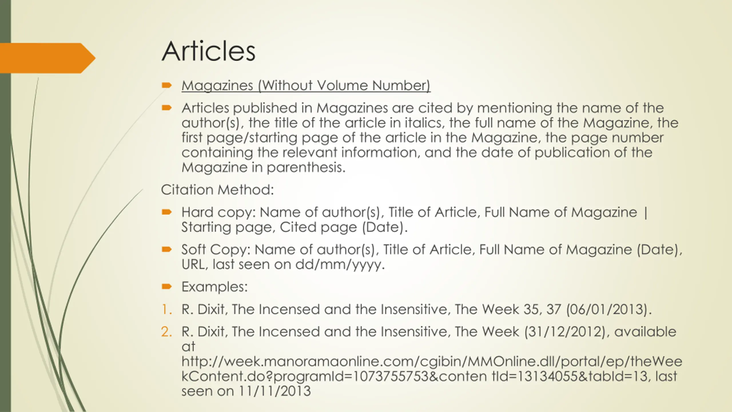 Articles Magazines (Without Volume Number) Articles published in Magazines are cited by mentioning the name of the author(s), the title of the article in italics, the full name of the Magazine, the first page/starting page of the article in the Magazine, the page number containing the relevant information, and the date of publication of the Magazine in parenthesis. Citation Method: Hard copy: Name of author(s), Title of Article, Full Name of Magazine | Starting page, Cited page (Date). Soft Copy: Name of author(s), Title of Article, Full Name of Magazine (Date), URL, last seen on dd/mm/yyyy. Examples: 1. R. Dixit, The Incensed and the Insensitive, The Week 35, 37 (06/01/2013). 2. R. Dixit, The Incensed and the Insensitive, The Week (31/12/2012), available at http://week.manoramaonline.com/cgibin/MMOnline.dll/portal/ep/theWee kContent.do?programId=1073755753&conten tId=13134055&tabId=13, last seen on 11/11/2013