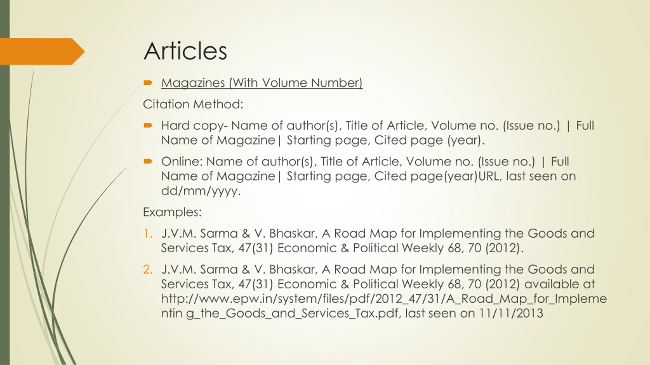 Articles Magazines (With Volume Number) Citation Method: Hard copy- Name of author(s), Title of Article, Volume no. (Issue no.) | Full Name of Magazine| Starting page, Cited page (year). Online: Name of author(s), Title of Article, Volume no. (Issue no.) | Full Name of Magazine| Starting page, Cited page(year)URL, last seen on dd/mm/yyyy. Examples: 1. J.V.M. Sarma & V. Bhaskar, A Road Map for Implementing the Goods and Services Tax, 47(31) Economic & Political Weekly 68, 70 (2012). 2. J.V.M. Sarma & V. Bhaskar, A Road Map for Implementing the Goods and Services Tax, 47(31) Economic & Political Weekly 68, 70 (2012) available at http://www.epw.in/system/files/pdf/2012_47/31/A_Road_Map_for_Impleme ntin g_the_Goods_and_Services_Tax.pdf, last seen on 11/11/2013