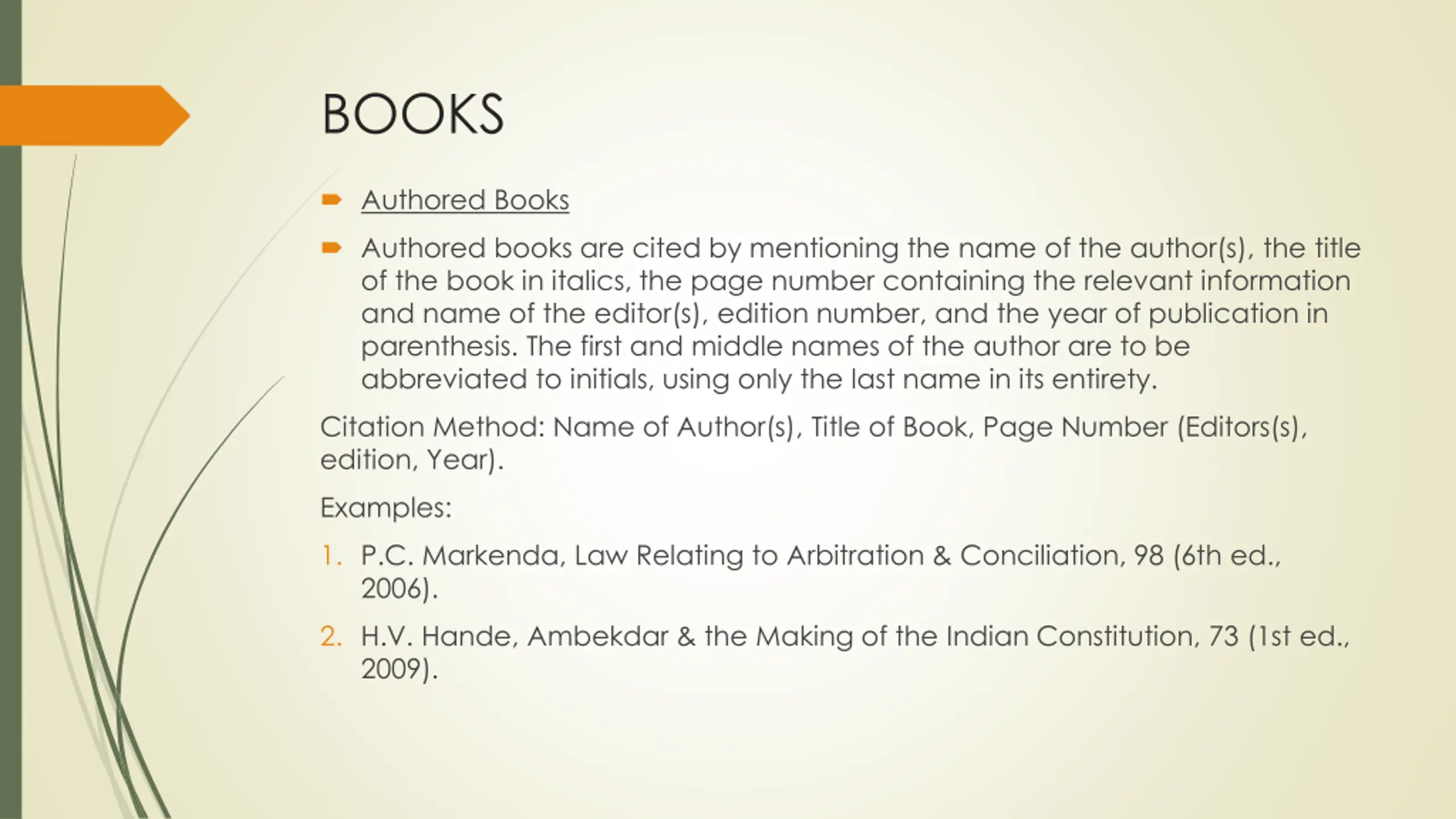 BOOKS Authored Books Authored books are cited by mentioning the name of the author(s), the title of the book in italics, the page number containing the relevant information and name of the editor(s), edition number, and the year of publication in parenthesis. The first and middle names of the author are to be abbreviated to initials, using only the last name in its entirety. Citation Method: Name of Author(s), Title of Book, Page Number (Editors(s), edition, Year). Examples: 1. P.C. Markenda, Law Relating to Arbitration & Conciliation, 98 (6th ed., 2006). 2. H.V. Hande, Ambekdar & the Making of the Indian Constitution, 73 (1st ed., 2009).