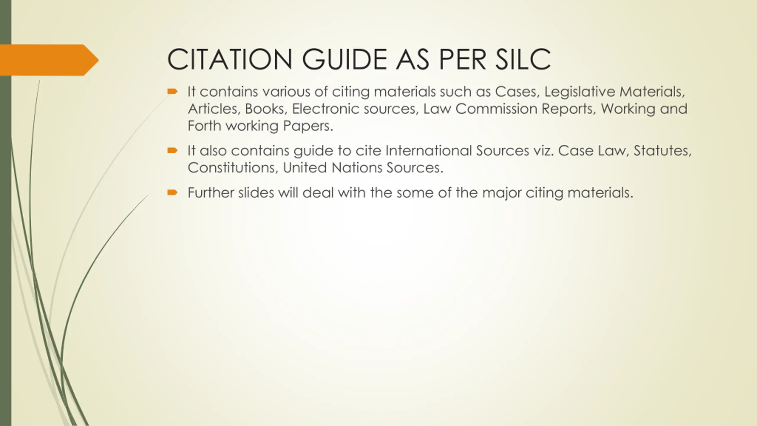 CITATION GUIDE AS PER SILC It contains various of citing materials such as Cases, Legislative Materials, Articles, Books, Electronic sources, Law Commission Reports, Working and Forth working Papers. It also contains guide to cite International Sources viz. Case Law, Statutes, Constitutions, United Nations Sources. Further slides will deal with the some of the major citing materials.