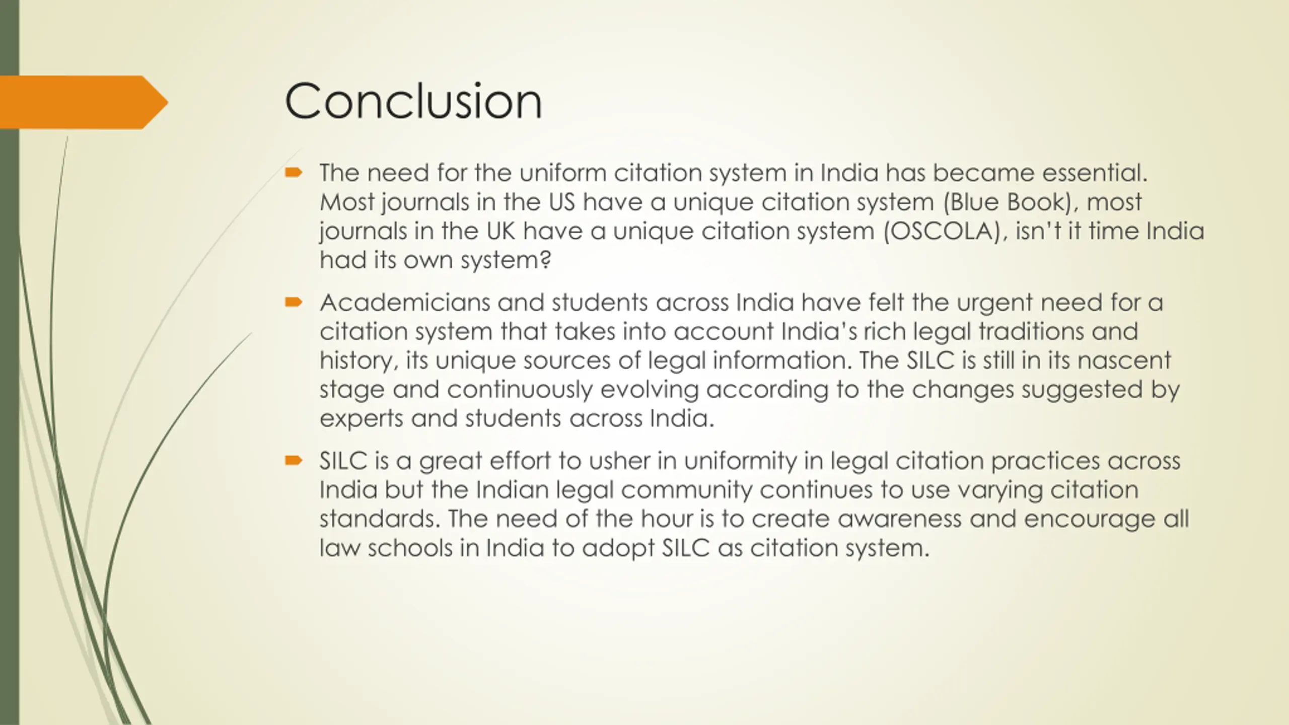 Conclusion The need for the uniform citation system in India has became essential. Most journals in the US have a unique citation system (Blue Book), most journals in the UK have a unique citation system (OSCOLA), isn t it time India had its own system? Academicians and students across India have felt the urgent need for a citation system that takes into account India s rich legal traditions and history, its unique sources of legal information. The SILC is still in its nascent stage and continuously evolving according to the changes suggested by experts and students across India. SILC is a great effort to usher in uniformity in legal citation practices across India but the Indian legal community continues to use varying citation standards. The need of the hour is to create awareness and encourage all law schools in India to adopt SILC as citation system.