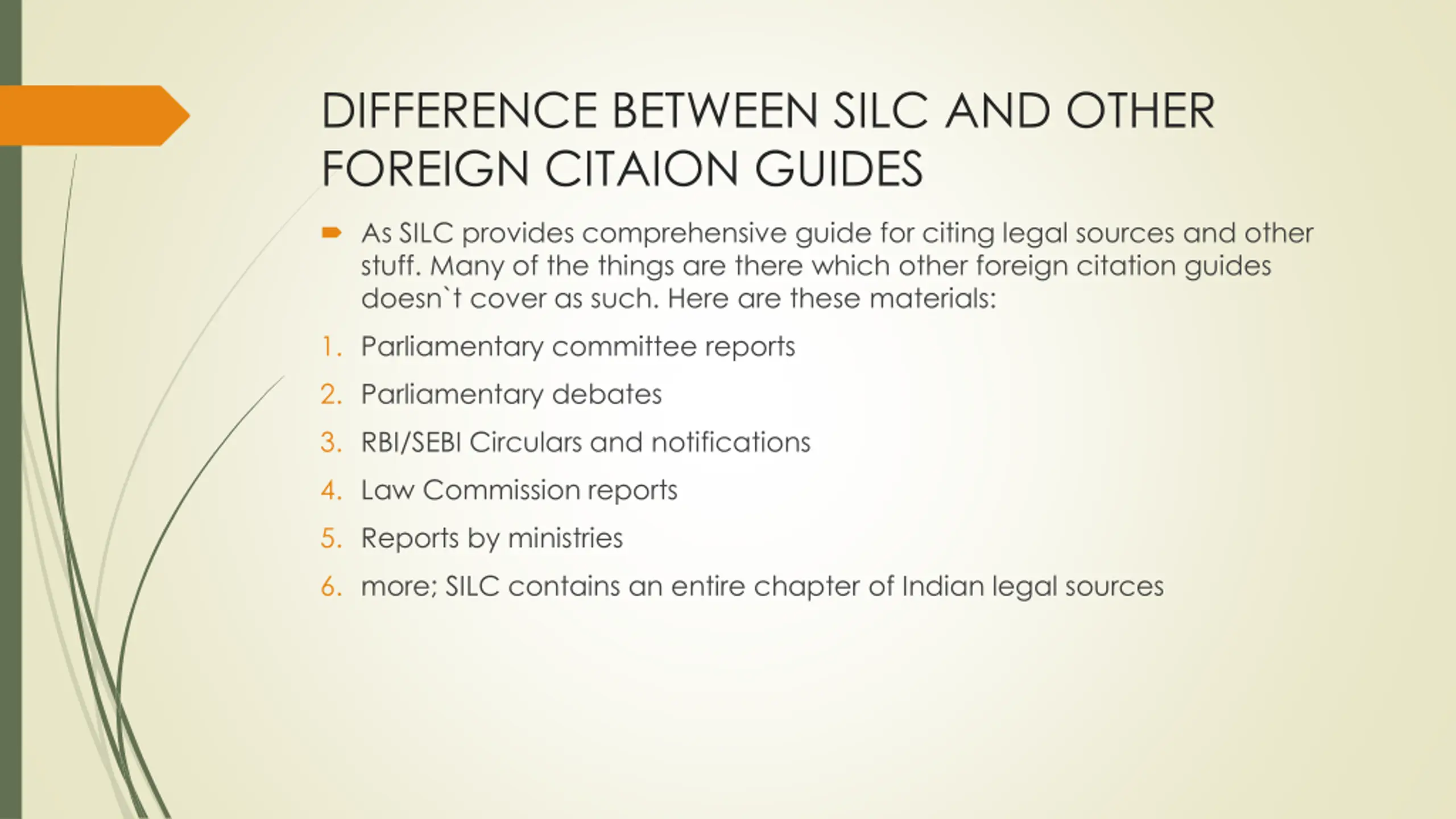 DIFFERENCE BETWEEN SILC AND OTHER FOREIGN CITAION GUIDES As SILC provides comprehensive guide for citing legal sources and other stuff. Many of the things are there which other foreign citation guides doesn`t cover as such. Here are these materials: 1. Parliamentary committee reports 2. Parliamentary debates 3. RBI/SEBI Circulars and notifications 4. Law Commission reports 5. Reports by ministries 6. more; SILC contains an entire chapter of Indian legal sources