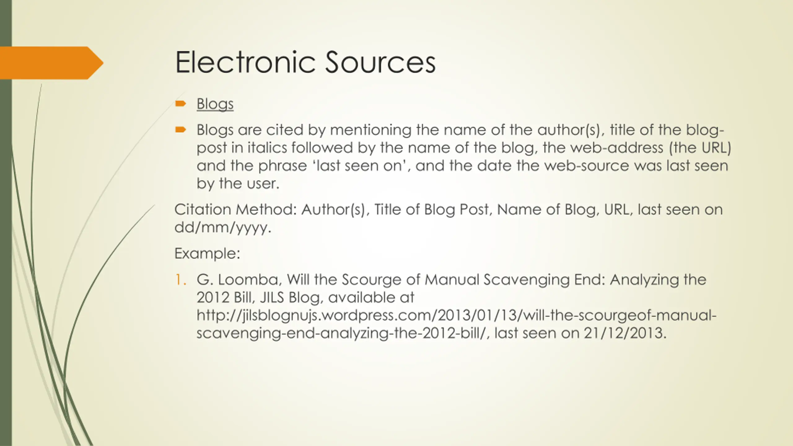 Electronic Sources Blogs Blogs are cited by mentioning the name of the author(s), title of the blog- post in italics followed by the name of the blog, the web-address (the URL) and the phrase last seen on , and the date the web-source was last seen by the user. Citation Method: Author(s), Title of Blog Post, Name of Blog, URL, last seen on dd/mm/yyyy. Example: 1. G. Loomba, Will the Scourge of Manual Scavenging End: Analyzing the 2012 Bill, JILS Blog, available at http://jilsblognujs.wordpress.com/2013/01/13/will-the-scourgeof-manual- scavenging-end-analyzing-the-2012-bill/, last seen on 21/12/2013.
