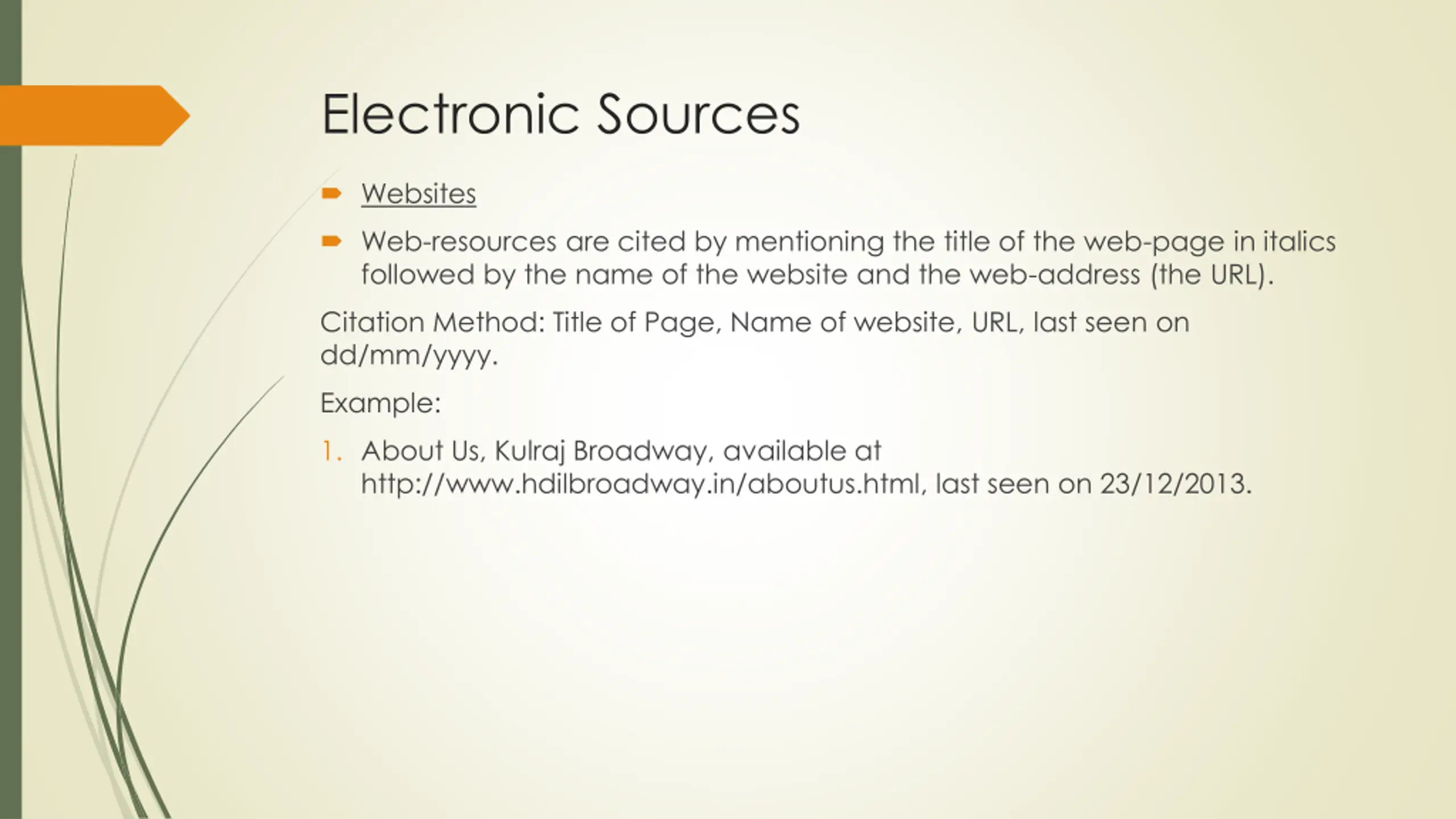 Electronic Sources Websites Web-resources are cited by mentioning the title of the web-page in italics followed by the name of the website and the web-address (the URL). Citation Method: Title of Page, Name of website, URL, last seen on dd/mm/yyyy. Example: 1. About Us, Kulraj Broadway, available at http://www.hdilbroadway.in/aboutus.html, last seen on 23/12/2013.