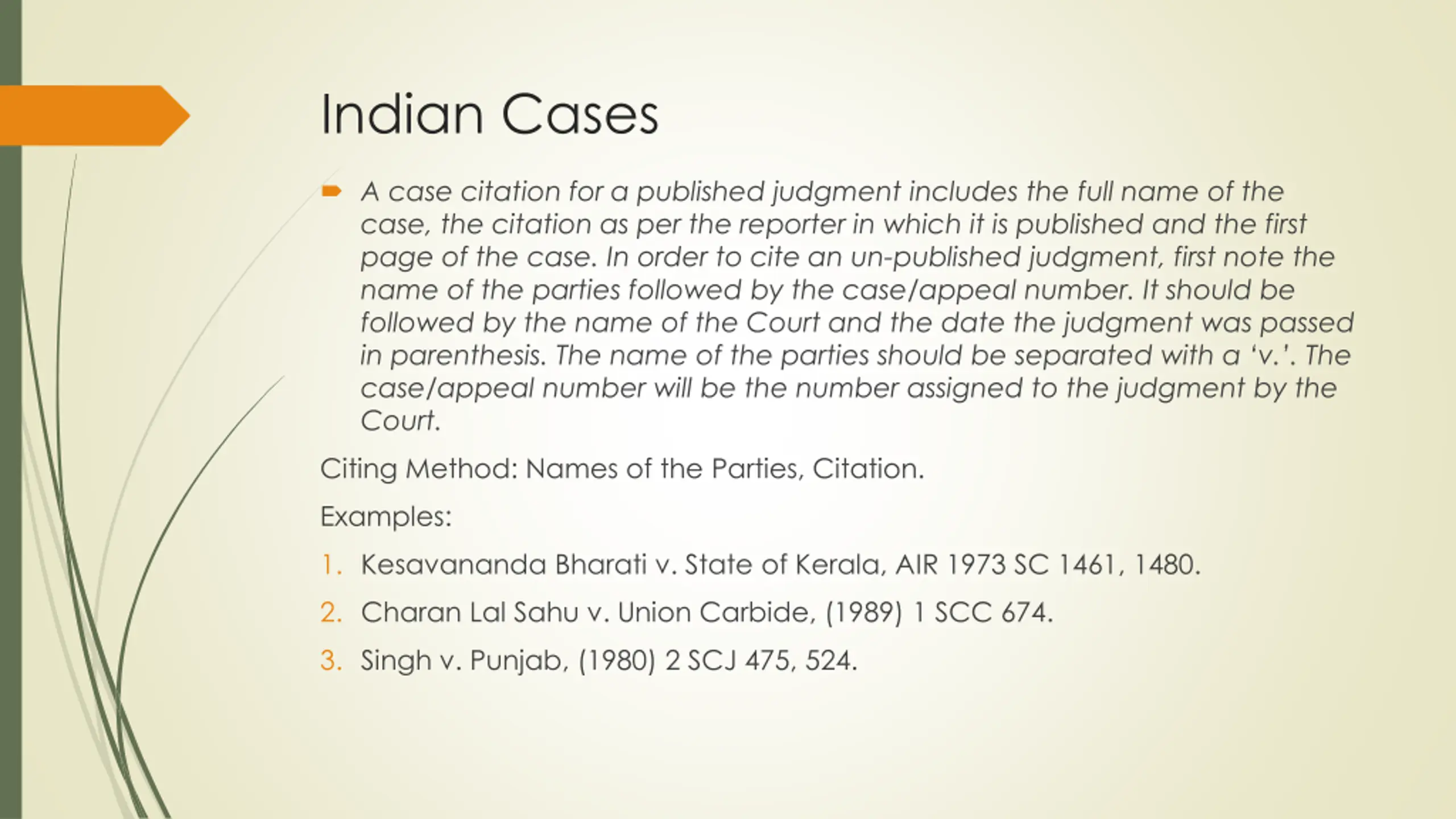 Indian Cases A case citation for a published judgment includes the full name of the case, the citation as per the reporter in which it is published and the first page of the case. In order to cite an un-published judgment, first note the name of the parties followed by the case/appeal number. It should be followed by the name of the Court and the date the judgment was passed in parenthesis. The name of the parties should be separated with a v. . The case/appeal number will be the number assigned to the judgment by the Court. Citing Method: Names of the Parties, Citation. Examples: 1. Kesavananda Bharati v. State of Kerala, AIR 1973 SC 1461, 1480. 2. Charan Lal Sahu v. Union Carbide, (1989) 1 SCC 674. 3. Singh v. Punjab, (1980) 2 SCJ 475, 524.