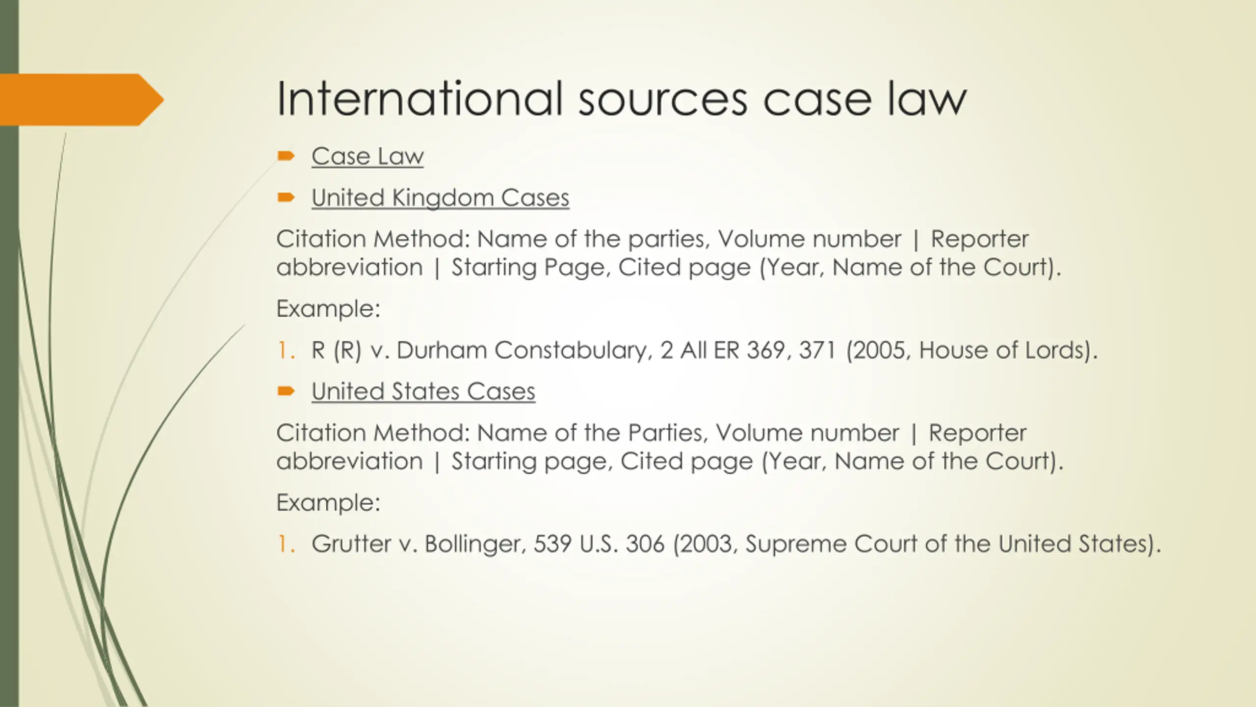 International sources case law Case Law United Kingdom Cases Citation Method: Name of the parties, Volume number | Reporter abbreviation | Starting Page, Cited page (Year, Name of the Court). Example: 1. R (R) v. Durham Constabulary, 2 All ER 369, 371 (2005, House of Lords). United States Cases Citation Method: Name of the Parties, Volume number | Reporter abbreviation | Starting page, Cited page (Year, Name of the Court). Example: 1. Grutter v. Bollinger, 539 U.S. 306 (2003, Supreme Court of the United States).