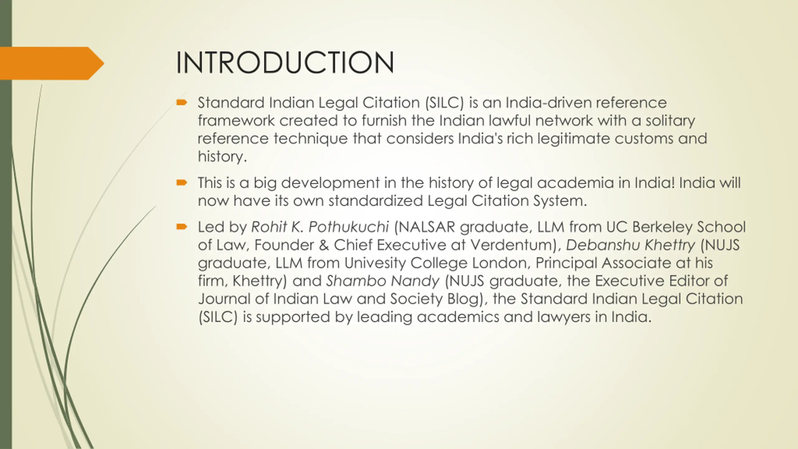 INTRODUCTION Standard Indian Legal Citation (SILC) is an India-driven reference framework created to furnish the Indian lawful network with a solitary reference technique that considers India's rich legitimate customs and history. This is a big development in the history of legal academia in India! India will now have its own standardized Legal Citation System. Led by Rohit K. Pothukuchi (NALSAR graduate, LLM from UC Berkeley School of Law, Founder & Chief Executive at Verdentum), Debanshu Khettry (NUJS graduate, LLM from Univesity College London, Principal Associate at his firm, Khettry) and Shambo Nandy (NUJS graduate, the Executive Editor of Journal of Indian Law and Society Blog), the Standard Indian Legal Citation (SILC) is supported by leading academics and lawyers in India.