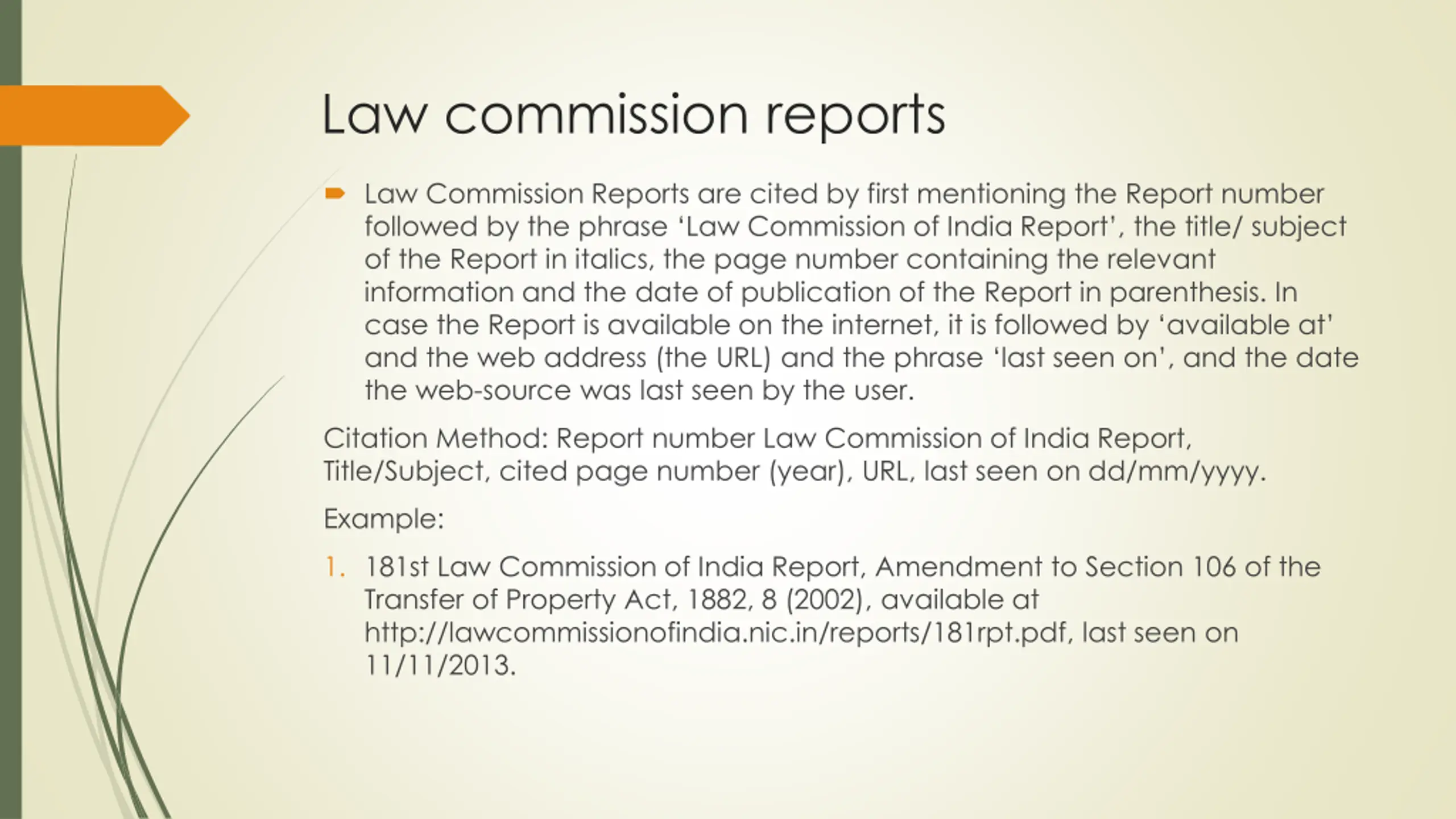 Law commission reports Law Commission Reports are cited by first mentioning the Report number followed by the phrase Law Commission of India Report , the title/ subject of the Report in italics, the page number containing the relevant information and the date of publication of the Report in parenthesis. In case the Report is available on the internet, it is followed by available at and the web address (the URL) and the phrase last seen on , and the date the web-source was last seen by the user. Citation Method: Report number Law Commission of India Report, Title/Subject, cited page number (year), URL, last seen on dd/mm/yyyy. Example: 1. 181st Law Commission of India Report, Amendment to Section 106 of the Transfer of Property Act, 1882, 8 (2002), available at http://lawcommissionofindia.nic.in/reports/181rpt.pdf, last seen on 11/11/2013.