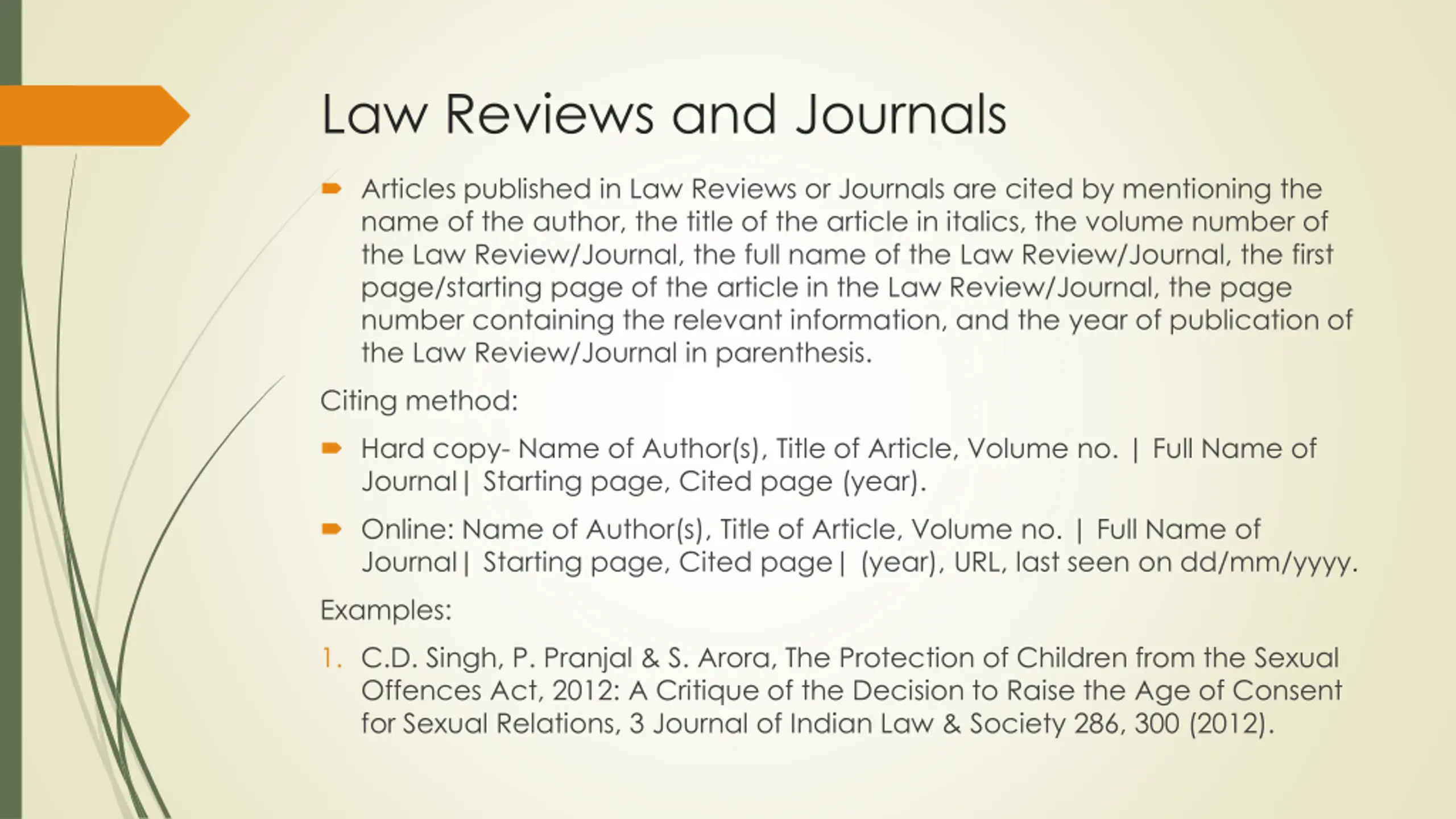 Law Reviews and Journals Articles published in Law Reviews or Journals are cited by mentioning the name of the author, the title of the article in italics, the volume number of the Law Review/Journal, the full name of the Law Review/Journal, the first page/starting page of the article in the Law Review/Journal, the page number containing the relevant information, and the year of publication of the Law Review/Journal in parenthesis. Citing method: Hard copy- Name of Author(s), Title of Article, Volume no. | Full Name of Journal| Starting page, Cited page (year). Online: Name of Author(s), Title of Article, Volume no. | Full Name of Journal| Starting page, Cited page| (year), URL, last seen on dd/mm/yyyy. Examples: 1. C.D. Singh, P. Pranjal & S. Arora, The Protection of Children from the Sexual Offences Act, 2012: A Critique of the Decision to Raise the Age of Consent for Sexual Relations, 3 Journal of Indian Law & Society 286, 300 (2012).