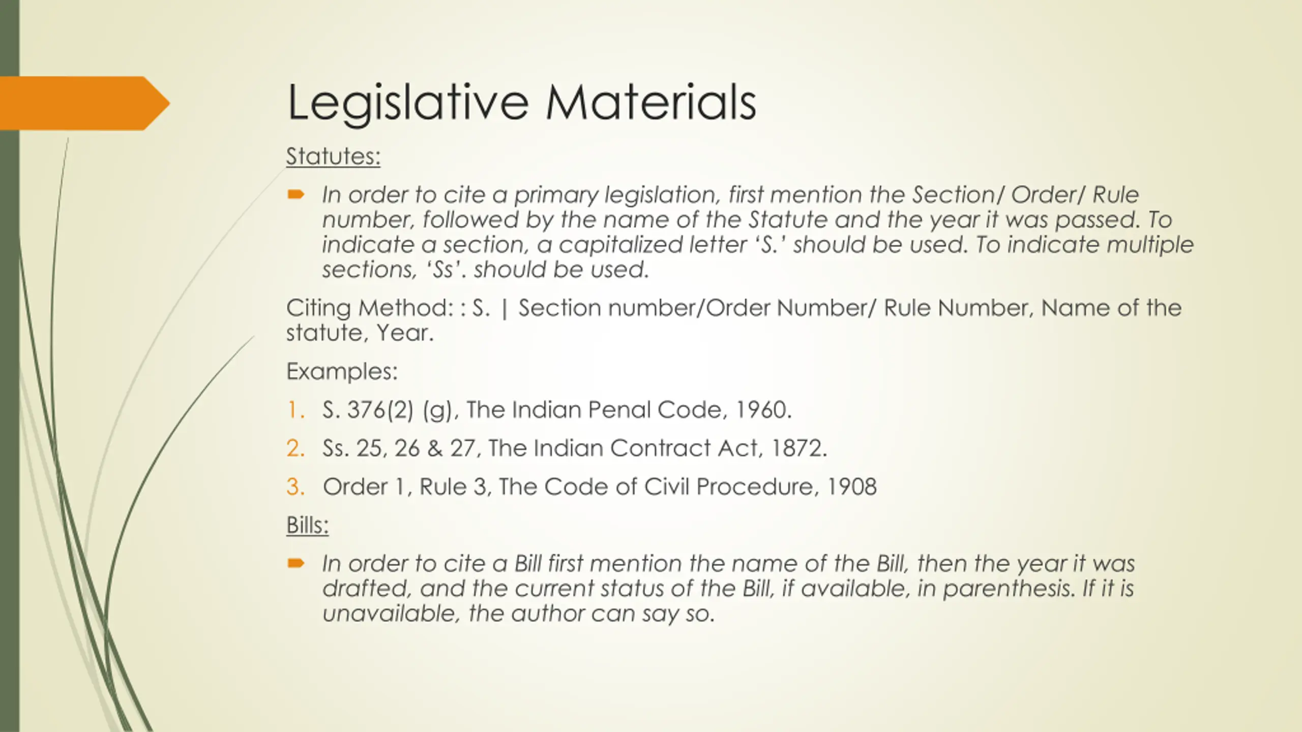 Legislative Materials Statutes: In order to cite a primary legislation, first mention the Section/ Order/ Rule number, followed by the name of the Statute and the year it was passed. To indicate a section, a capitalized letter S. should be used. To indicate multiple sections, Ss . should be used. Citing Method: : S. | Section number/Order Number/ Rule Number, Name of the statute, Year. Examples: 1. S. 376(2) (g), The Indian Penal Code, 1960. 2. Ss. 25, 26 & 27, The Indian Contract Act, 1872. 3. Order 1, Rule 3, The Code of Civil Procedure, 1908 Bills: In order to cite a Bill first mention the name of the Bill, then the year it was drafted, and the current status of the Bill, if available, in parenthesis. If it is unavailable, the author can say so.