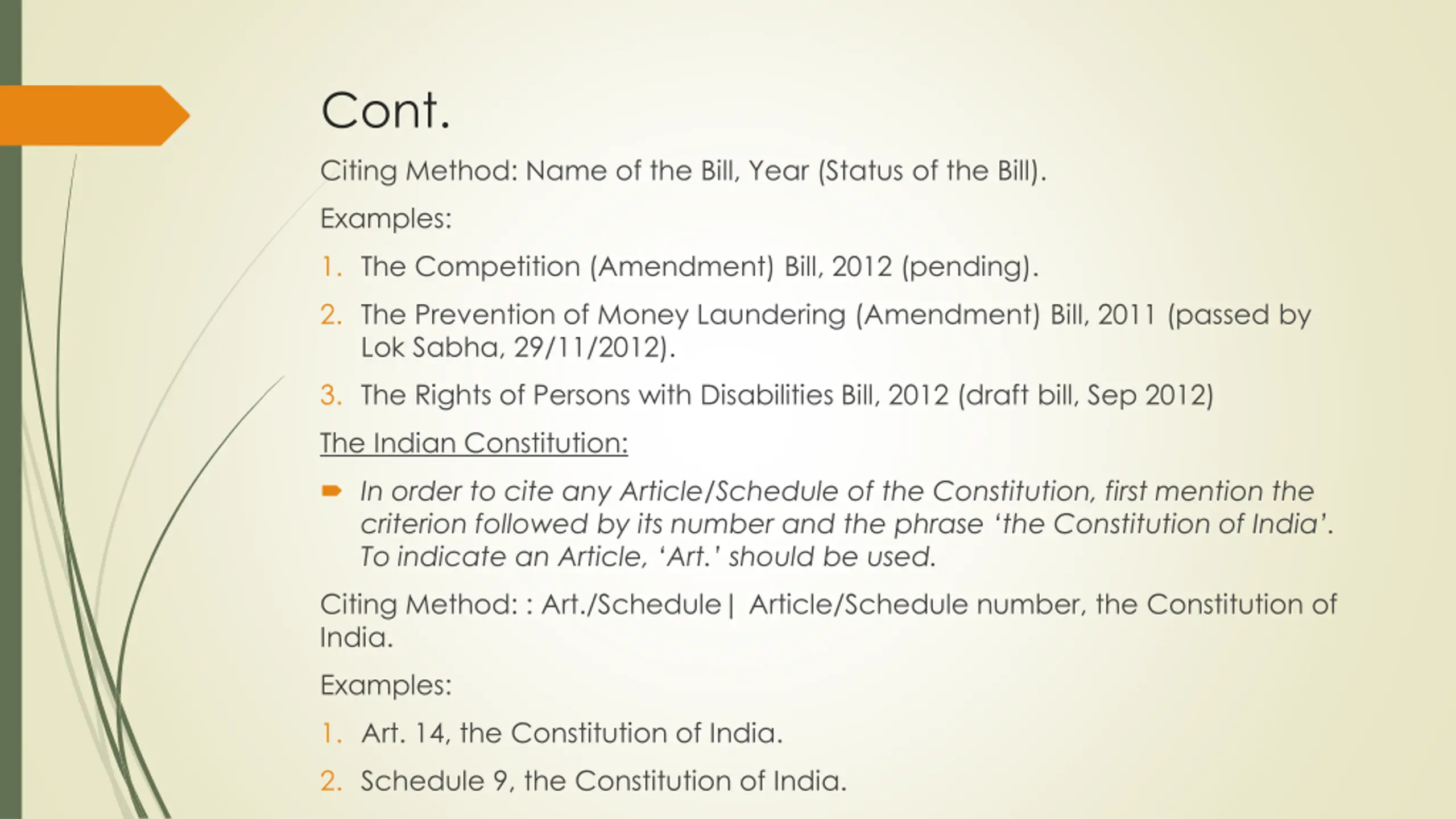 Cont. Citing Method: Name of the Bill, Year (Status of the Bill). Examples: 1. The Competition (Amendment) Bill, 2012 (pending). 2. The Prevention of Money Laundering (Amendment) Bill, 2011 (passed by Lok Sabha, 29/11/2012). 3. The Rights of Persons with Disabilities Bill, 2012 (draft bill, Sep 2012) The Indian Constitution: In order to cite any Article/Schedule of the Constitution, first mention the criterion followed by its number and the phrase the Constitution of India . To indicate an Article, Art. should be used. Citing Method: : Art./Schedule| Article/Schedule number, the Constitution of India. Examples: 1. Art. 14, the Constitution of India. 2. Schedule 9, the Constitution of India.