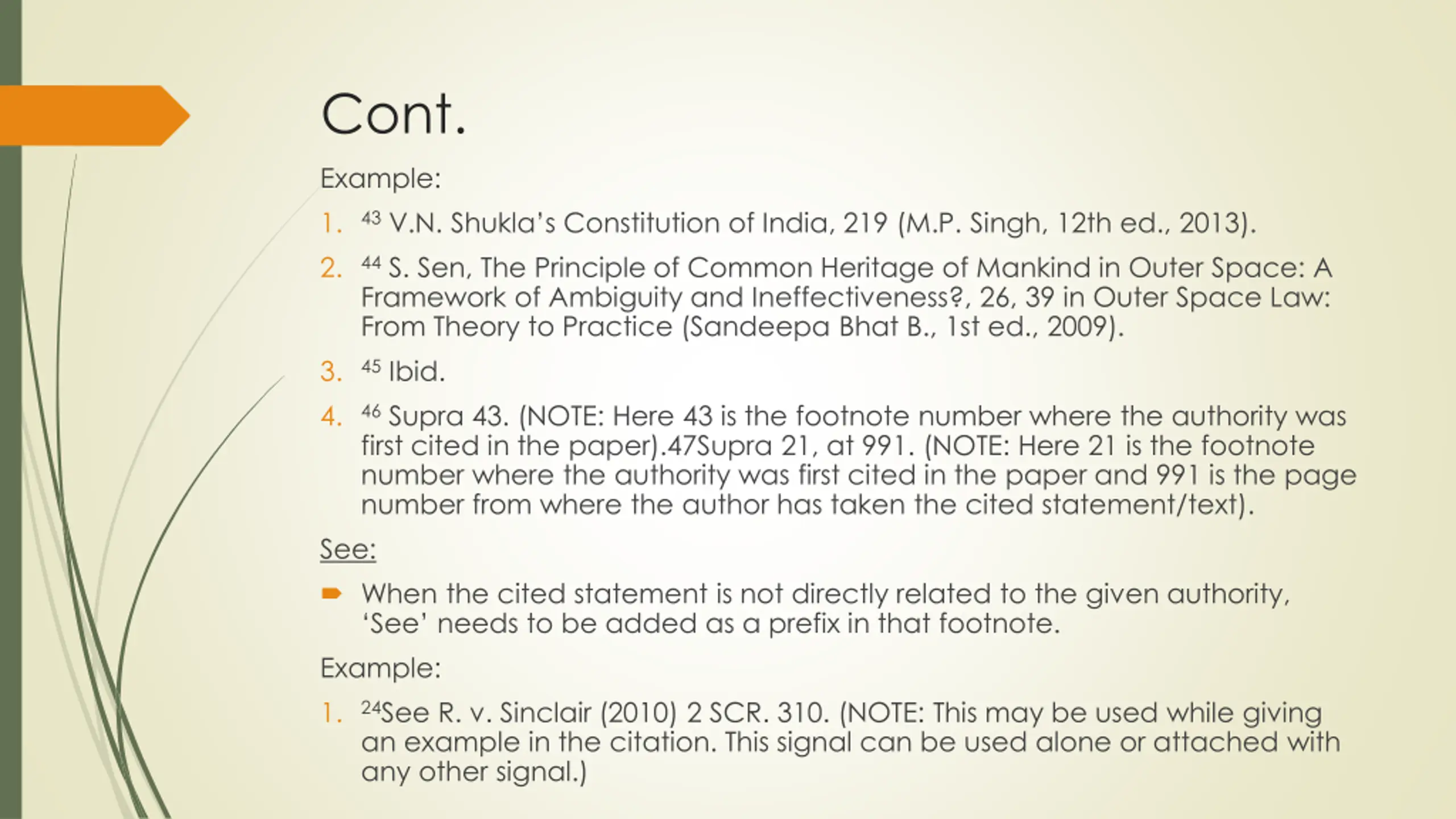 Cont. Example: 1. 2. Framework of Ambiguity and Ineffectiveness?, 26, 39 in Outer Space Law: From Theory to Practice (Sandeepa Bhat B., 1st ed., 2009). 3. 4. first cited in the paper).47Supra 21, at 991. (NOTE: Here 21 is the footnote number where the authority was first cited in the paper and 991 is the page number from where the author has taken the cited statement/text). See: When the cited statement is not directly related to the given authority, See needs to be added as a prefix in that footnote. Example: 1. an example in the citation. This signal can be used alone or attached with any other signal.) 43V.N. Shukla s Constitution of India, 219 (M.P. Singh, 12th ed., 2013). 44S. Sen, The Principle of Common Heritage of Mankind in Outer Space: A 45Ibid. 46Supra 43. (NOTE: Here 43 is the footnote number where the authority was 24See R. v. Sinclair (2010) 2 SCR. 310. (NOTE: This may be used while giving