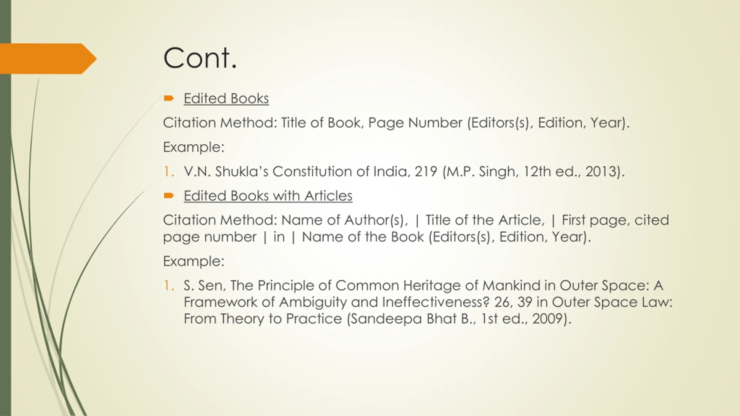 Cont. Edited Books Citation Method: Title of Book, Page Number (Editors(s), Edition, Year). Example: 1. V.N. Shukla s Constitution of India, 219 (M.P. Singh, 12th ed., 2013). Edited Books with Articles Citation Method: Name of Author(s), | Title of the Article, | First page, cited page number | in | Name of the Book (Editors(s), Edition, Year). Example: 1. S. Sen, The Principle of Common Heritage of Mankind in Outer Space: A Framework of Ambiguity and Ineffectiveness? 26, 39 in Outer Space Law: From Theory to Practice (Sandeepa Bhat B., 1st ed., 2009).