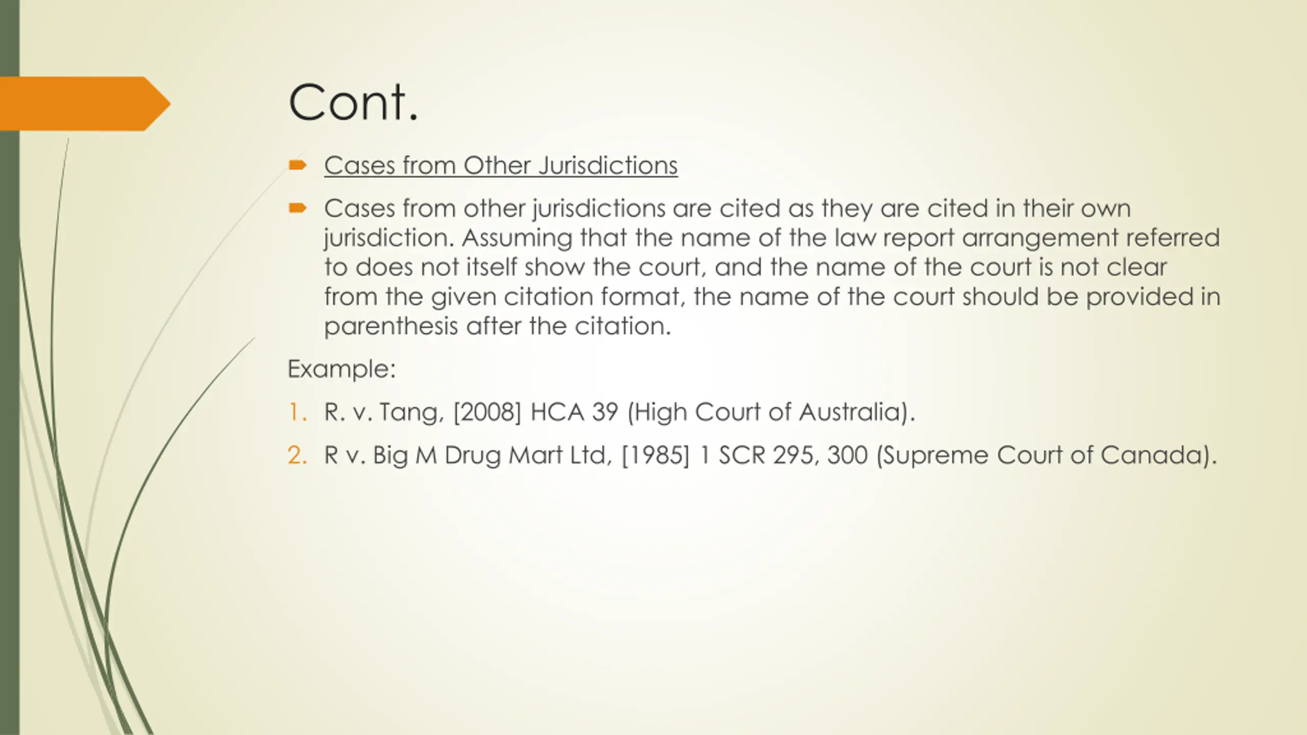 Cont. Cases from Other Jurisdictions Cases from other jurisdictions are cited as they are cited in their own jurisdiction. Assuming that the name of the law report arrangement referred to does not itself show the court, and the name of the court is not clear from the given citation format, the name of the court should be provided in parenthesis after the citation. Example: 1. R. v. Tang, [2008] HCA 39 (High Court of Australia). 2. R v. Big M Drug Mart Ltd, [1985] 1 SCR 295, 300 (Supreme Court of Canada).