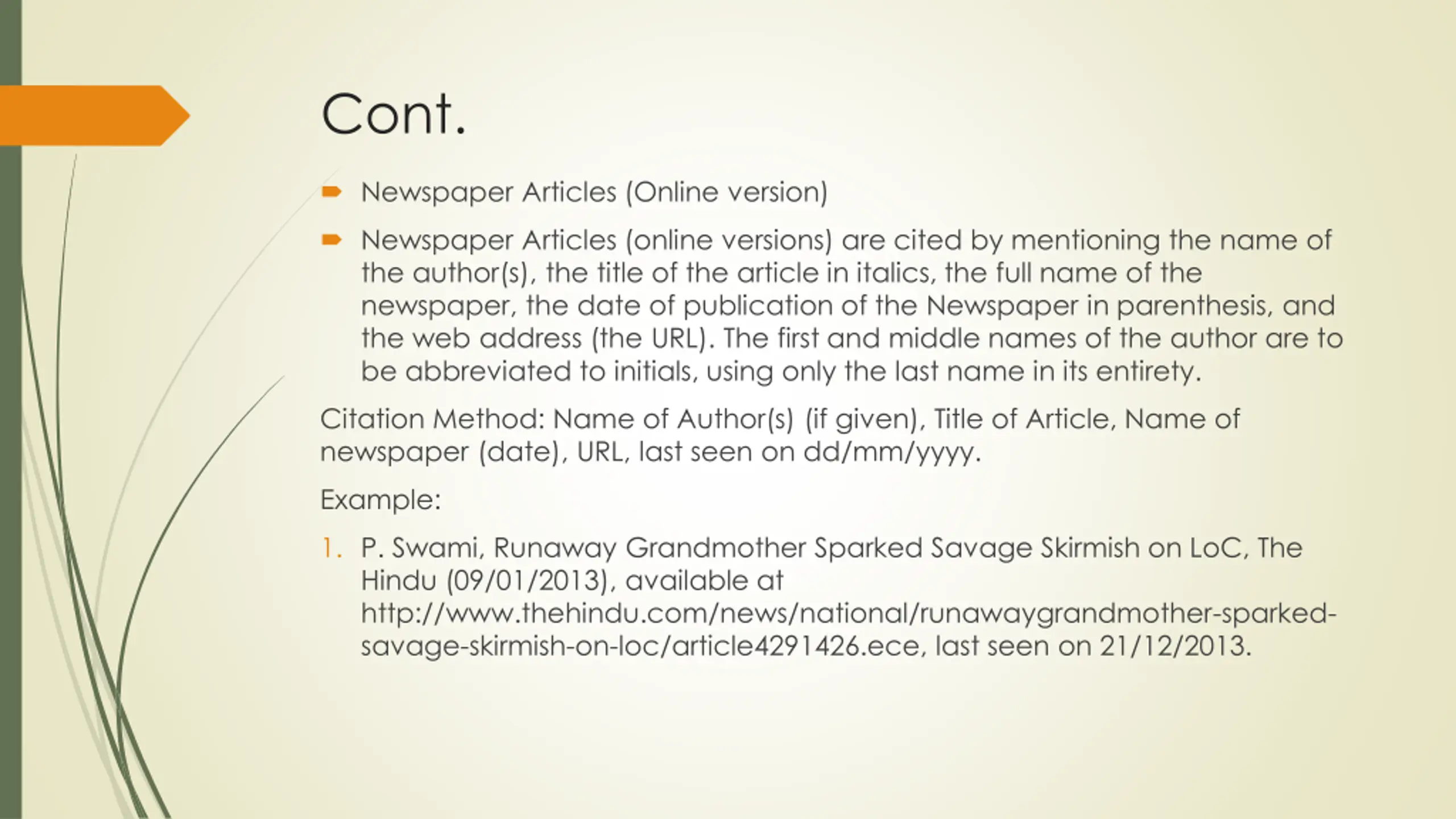 Cont. Newspaper Articles (Online version) Newspaper Articles (online versions) are cited by mentioning the name of the author(s), the title of the article in italics, the full name of the newspaper, the date of publication of the Newspaper in parenthesis, and the web address (the URL). The first and middle names of the author are to be abbreviated to initials, using only the last name in its entirety. Citation Method: Name of Author(s) (if given), Title of Article, Name of newspaper (date), URL, last seen on dd/mm/yyyy. Example: 1. P. Swami, Runaway Grandmother Sparked Savage Skirmish on LoC, The Hindu (09/01/2013), available at http://www.thehindu.com/news/national/runawaygrandmother-sparked- savage-skirmish-on-loc/article4291426.ece, last seen on 21/12/2013.