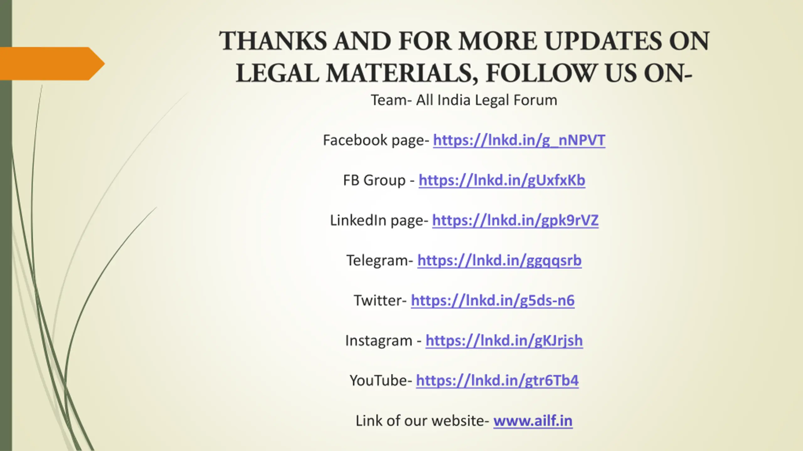Team- All India Legal Forum Facebook page- https://lnkd.in/g_nNPVT FB Group - https://lnkd.in/gUxfxKb LinkedIn page- https://lnkd.in/gpk9rVZ Telegram- https://lnkd.in/ggqqsrb Twitter- https://lnkd.in/g5ds-n6 Instagram - https://lnkd.in/gKJrjsh YouTube- https://lnkd.in/gtr6Tb4 Link of our website- www.ailf.in