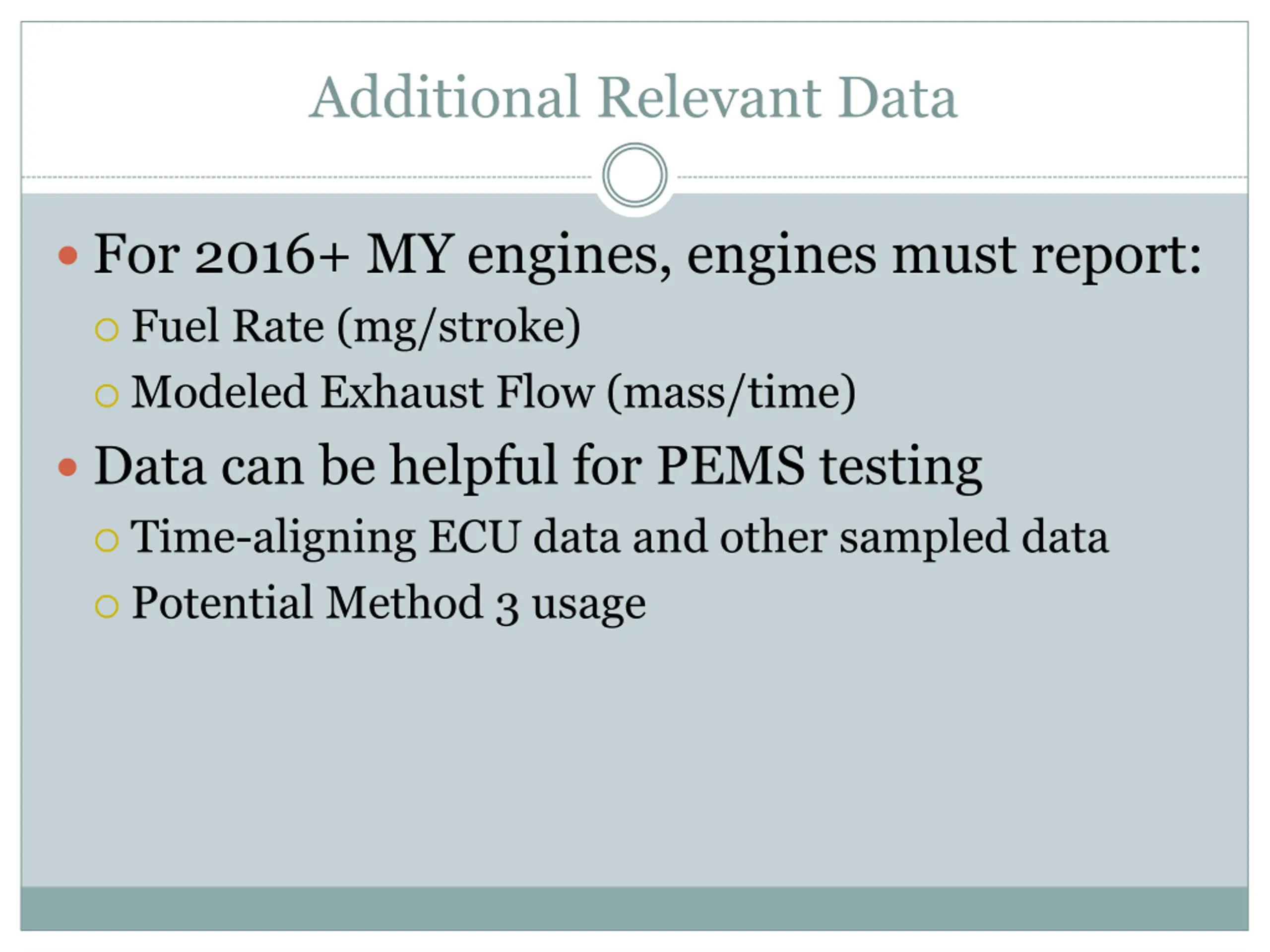 Additional Relevant Data For 2016+ MY engines, engines must report: Fuel Rate (mg/stroke) Modeled Exhaust Flow (mass/time) Data can be helpful for PEMS testing Time-aligning ECU data and other sampled data Potential Method 3 usage
