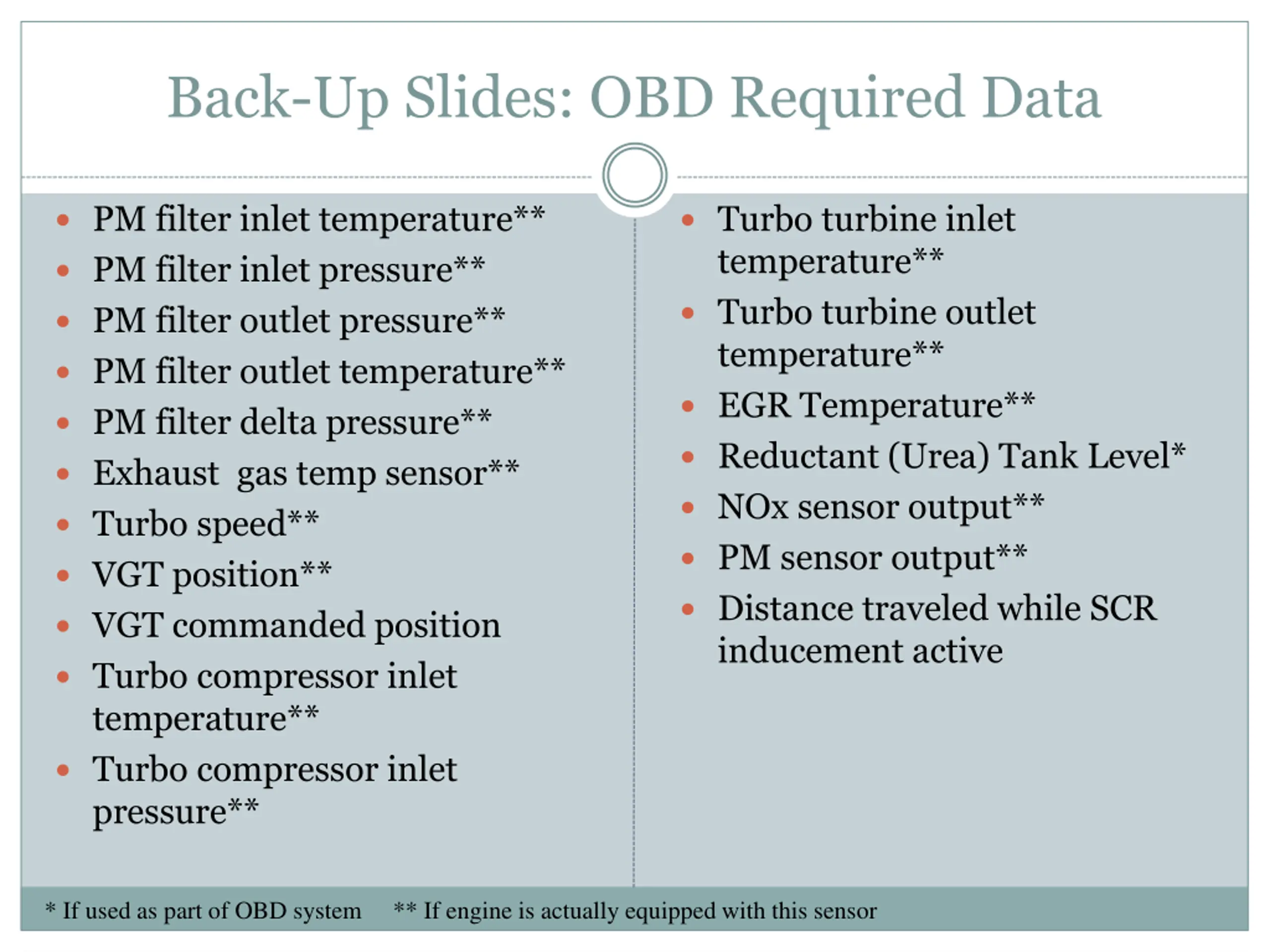 Back-Up Slides: OBD Required Data PM filter inlet temperature** PM filter inlet pressure** PM filter outlet pressure** PM filter outlet temperature** PM filter delta pressure** Exhaust gas temp sensor** Turbo speed** VGT position** VGT commanded position Turbo compressor inlet temperature** Turbo compressor inlet pressure** Turbo turbine inlet temperature** Turbo turbine outlet temperature** EGR Temperature** Reductant (Urea) Tank Level* NOx sensor output** PM sensor output** Distance traveled while SCR inducement active * If used as part of OBD system ** If engine is actually equipped with this sensor