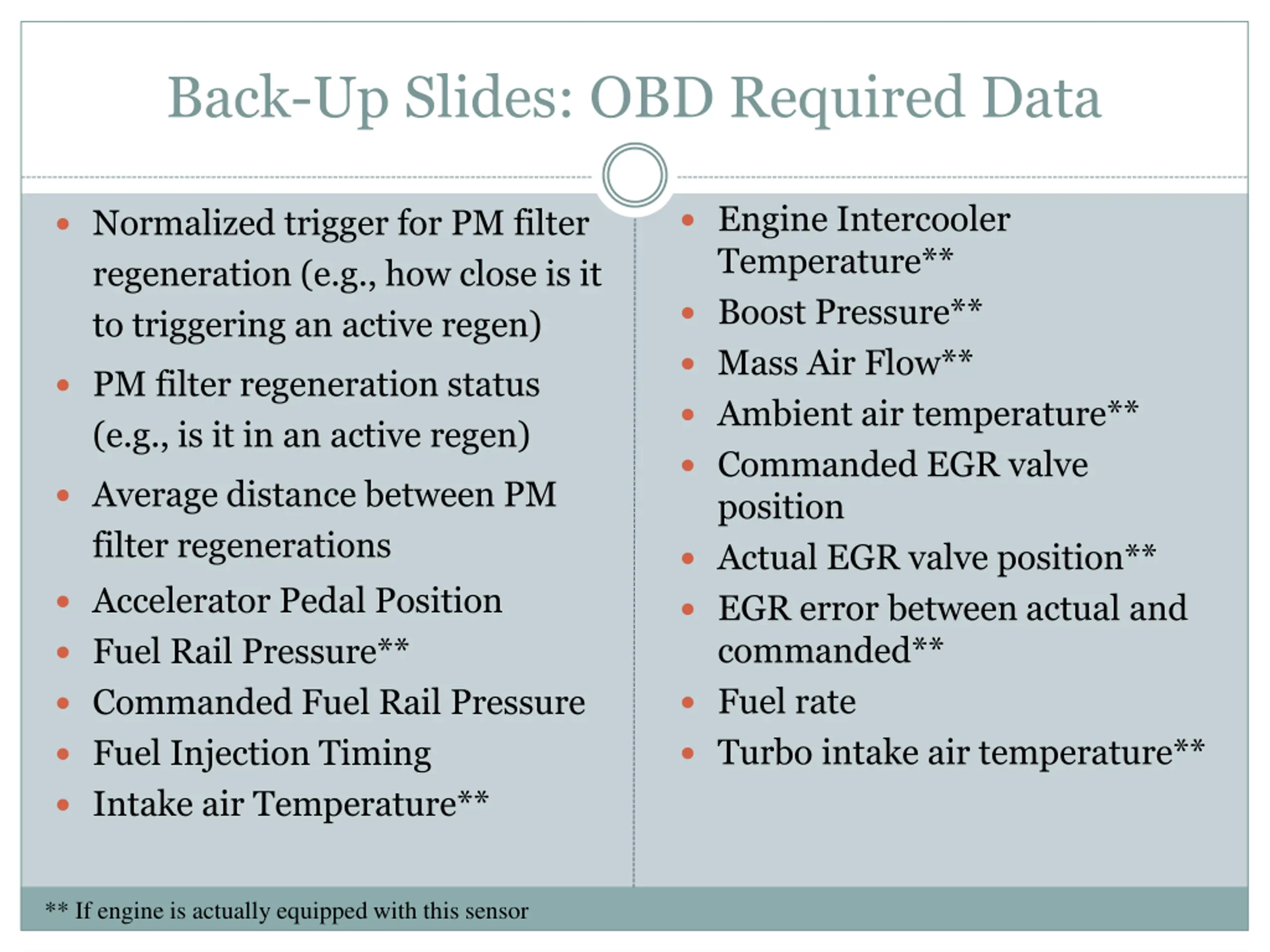 Back-Up Slides: OBD Required Data Engine Intercooler Temperature** Boost Pressure** Mass Air Flow** Ambient air temperature** Commanded EGR valve position Actual EGR valve position** EGR error between actual and commanded** Fuel rate Turbo intake air temperature** Normalized trigger for PM filter regeneration (e.g., how close is it to triggering an active regen) PM filter regeneration status (e.g., is it in an active regen) Average distance between PM filter regenerations Accelerator Pedal Position Fuel Rail Pressure** Commanded Fuel Rail Pressure Fuel Injection Timing Intake air Temperature** ** If engine is actually equipped with this sensor