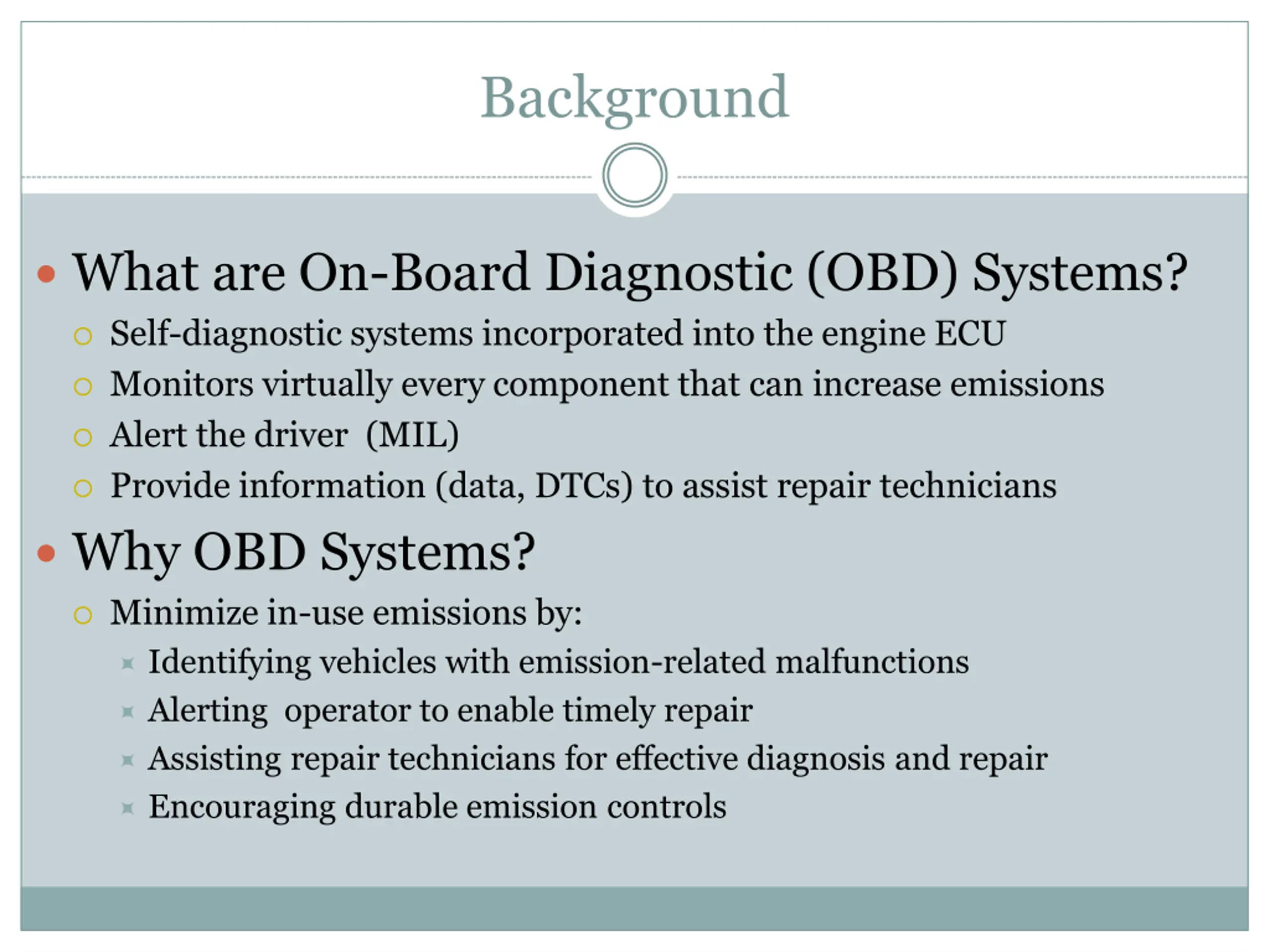 Background What are On-Board Diagnostic (OBD) Systems? Self-diagnostic systems incorporated into the engine ECU Monitors virtually every component that can increase emissions Alert the driver (MIL) Provide information (data, DTCs) to assist repair technicians Why OBD Systems? Minimize in-use emissions by: Identifying vehicles with emission-related malfunctions Alerting operator to enable timely repair Assisting repair technicians for effective diagnosis and repair Encouraging durable emission controls