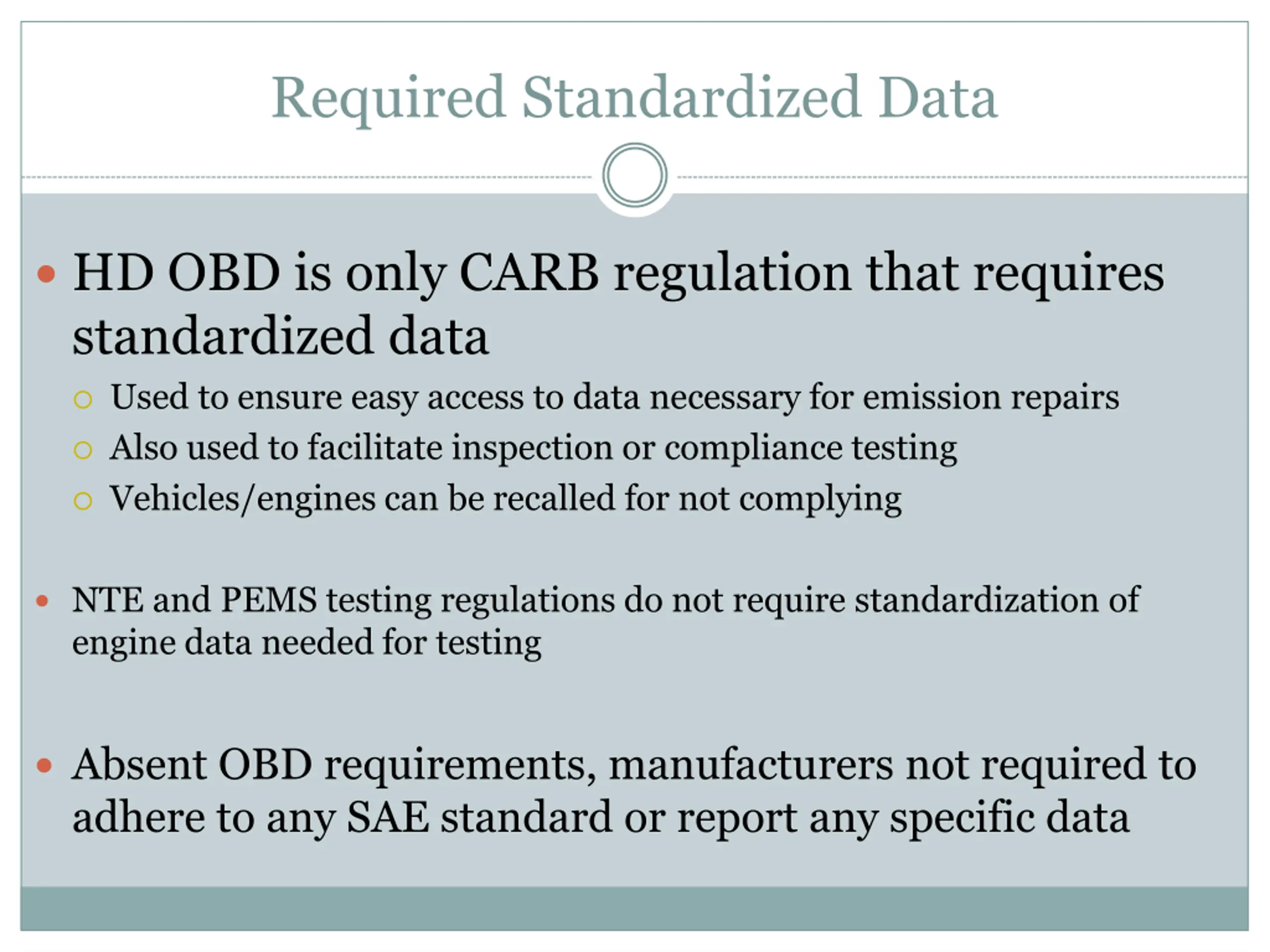 Required Standardized Data HD OBD is only CARB regulation that requires standardized data Used to ensure easy access to data necessary for emission repairs Also used to facilitate inspection or compliance testing Vehicles/engines can be recalled for not complying NTE and PEMS testing regulations do not require standardization of engine data needed for testing Absent OBD requirements, manufacturers not required to adhere to any SAE standard or report any specific data