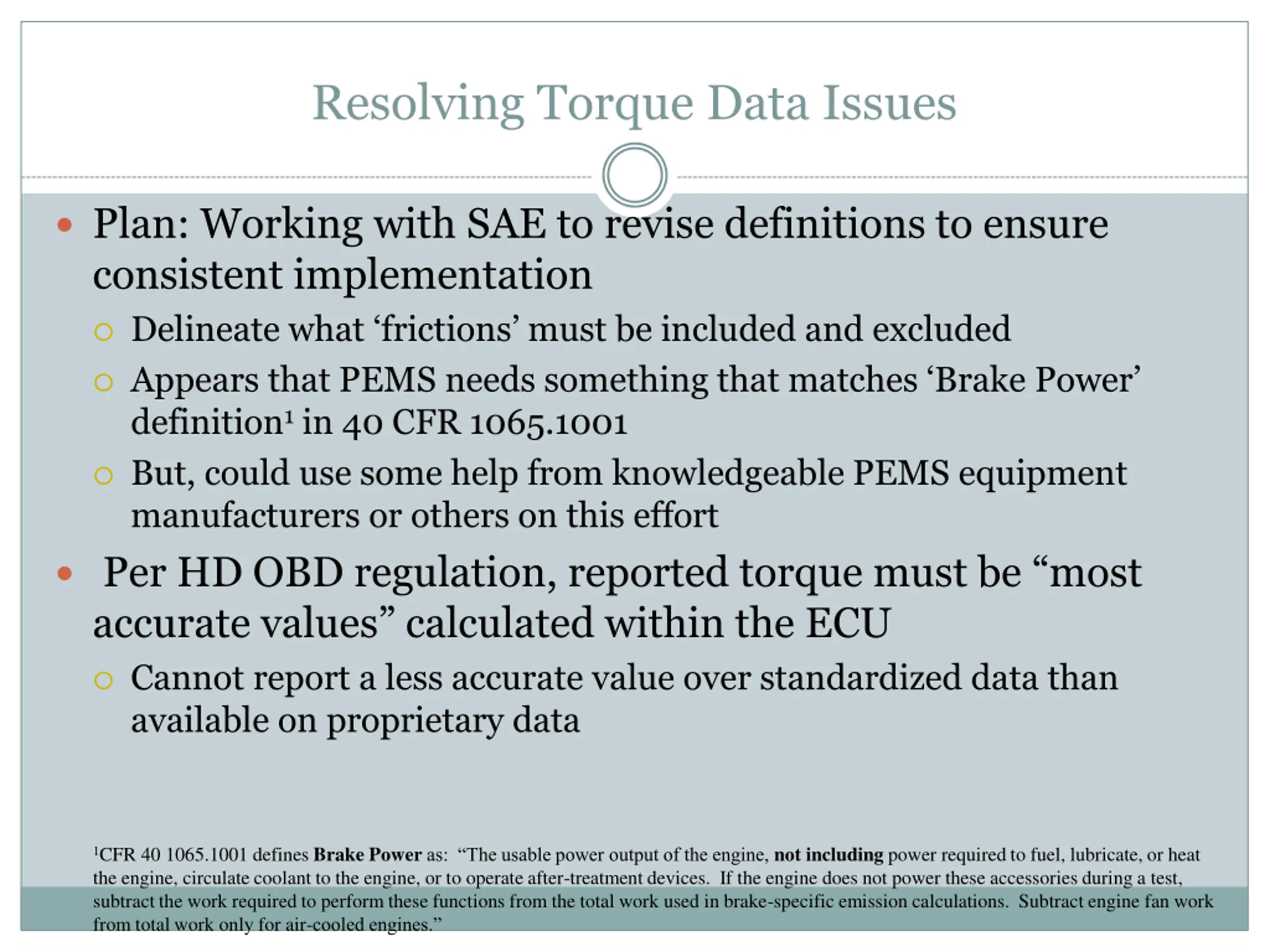 Resolving Torque Data Issues Plan: Working with SAE to revise definitions to ensure consistent implementation Delineate what frictions must be included and excluded Appears that PEMS needs something that matches Brake Power definition1 in 40 CFR 1065.1001 But, could use some help from knowledgeable PEMS equipment manufacturers or others on this effort Per HD OBD regulation, reported torque must be most accurate values calculated within the ECU Cannot report a less accurate value over standardized data than available on proprietary data 1CFR 40 1065.1001 defines Brake Power as: The usable power output of the engine, not including power required to fuel, lubricate, or heat the engine, circulate coolant to the engine, or to operate after-treatment devices. If the engine does not power these accessories during a test, subtract the work required to perform these functions from the total work used in brake-specific emission calculations. Subtract engine fan work from total work only for air-cooled engines.