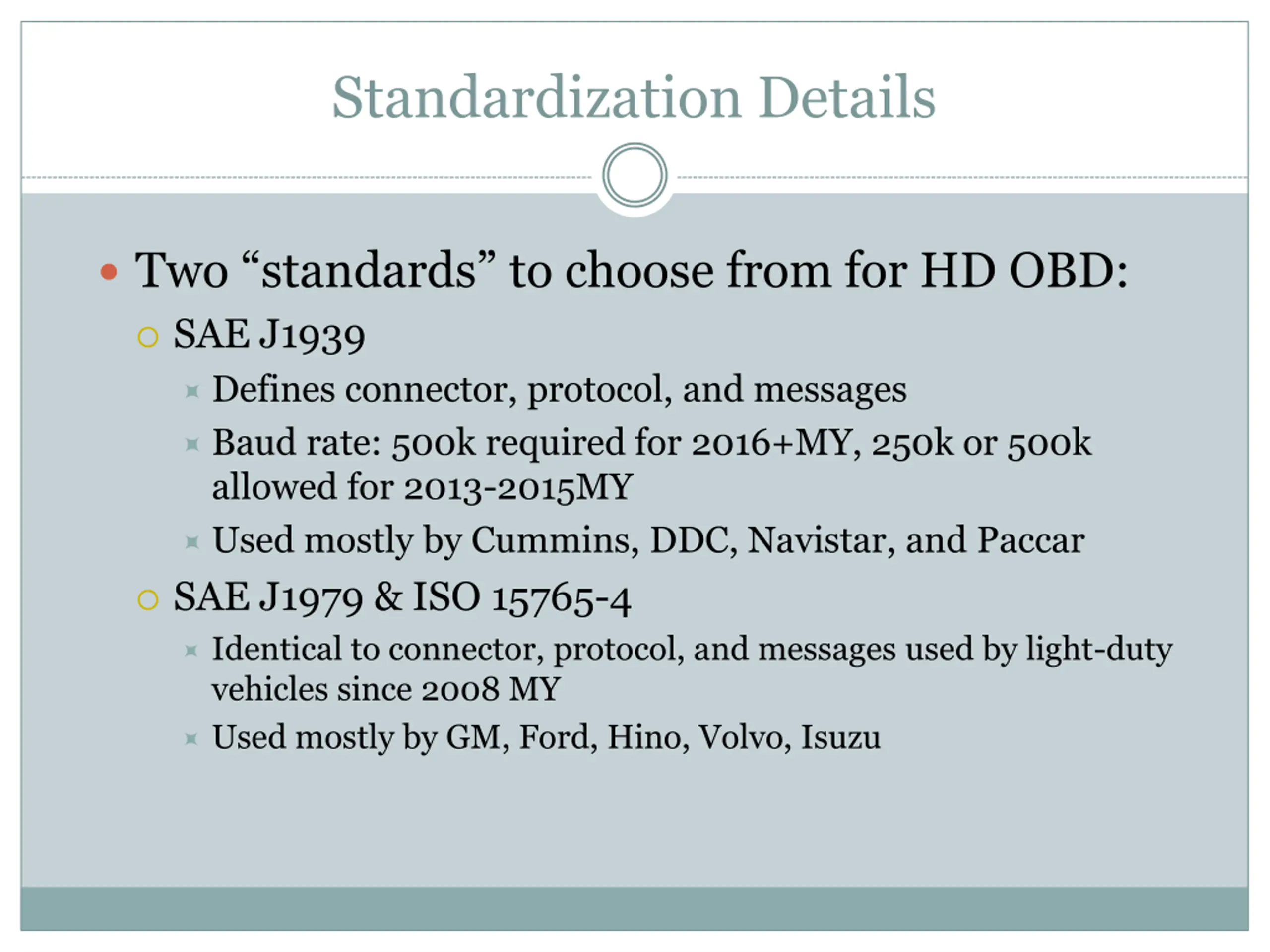 Standardization Details Two standards to choose from for HD OBD: SAE J1939 Defines connector, protocol, and messages Baud rate: 500k required for 2016+MY, 250k or 500k allowed for 2013-2015MY Used mostly by Cummins, DDC, Navistar, and Paccar SAE J1979 & ISO 15765-4 Identical to connector, protocol, and messages used by light-duty vehicles since 2008 MY Used mostly by GM, Ford, Hino, Volvo, Isuzu