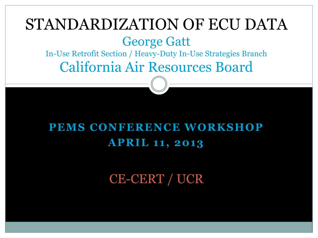 STANDARDIZATION OF ECU DATA George Gatt In-Use Retrofit Section / Heavy-Duty In-Use Strategies Branch California Air Resources Board PEMS CONFERENCE WORKSHOP APRIL 11, 2013 CE-CERT / UCR