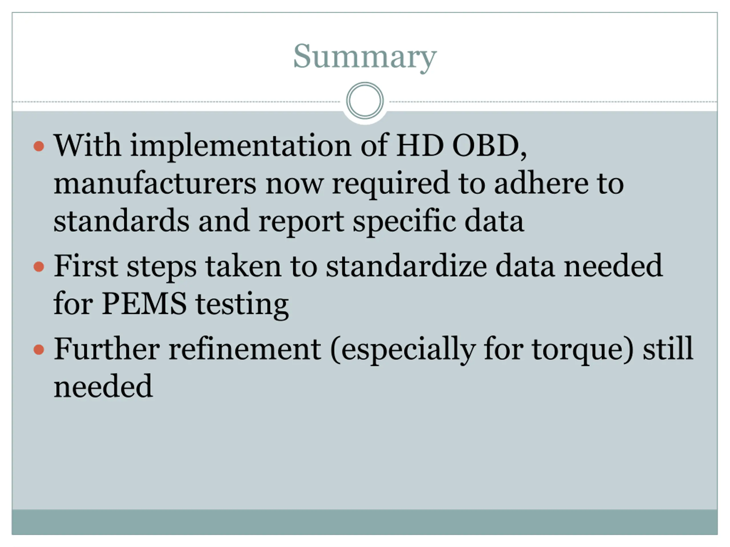 Summary With implementation of HD OBD, manufacturers now required to adhere to standards and report specific data First steps taken to standardize data needed for PEMS testing Further refinement (especially for torque) still needed
