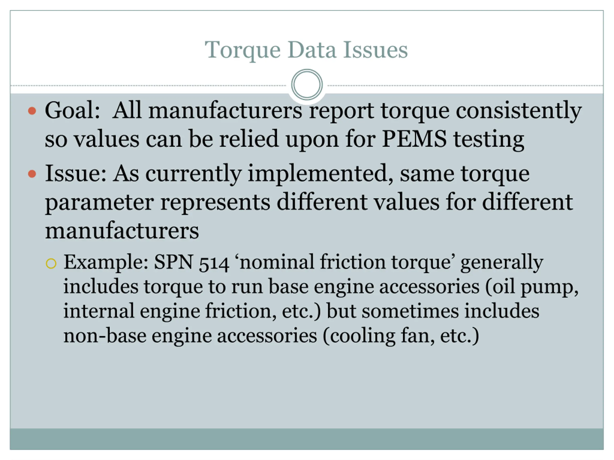 Torque Data Issues Goal: All manufacturers report torque consistently so values can be relied upon for PEMS testing Issue: As currently implemented, same torque parameter represents different values for different manufacturers Example: SPN 514 nominal friction torque generally includes torque to run base engine accessories (oil pump, internal engine friction, etc.) but sometimes includes non-base engine accessories (cooling fan, etc.)