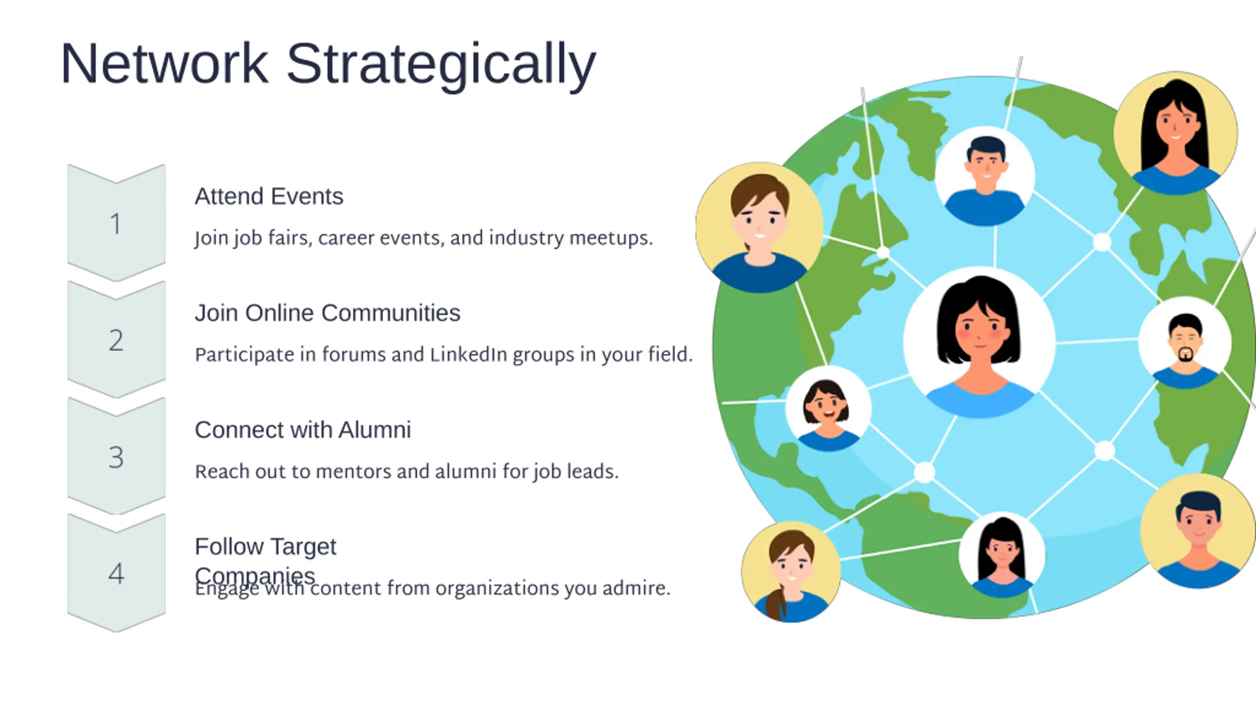 Network Strategically Attend Events Join job fairs, career events, and industry meetups. Join Online Communities Participate in forums and LinkedIn groups in your field. Connect with Alumni Reach out to mentors and alumni for job leads. Follow Target Companies Engage with content from organizations you admire.