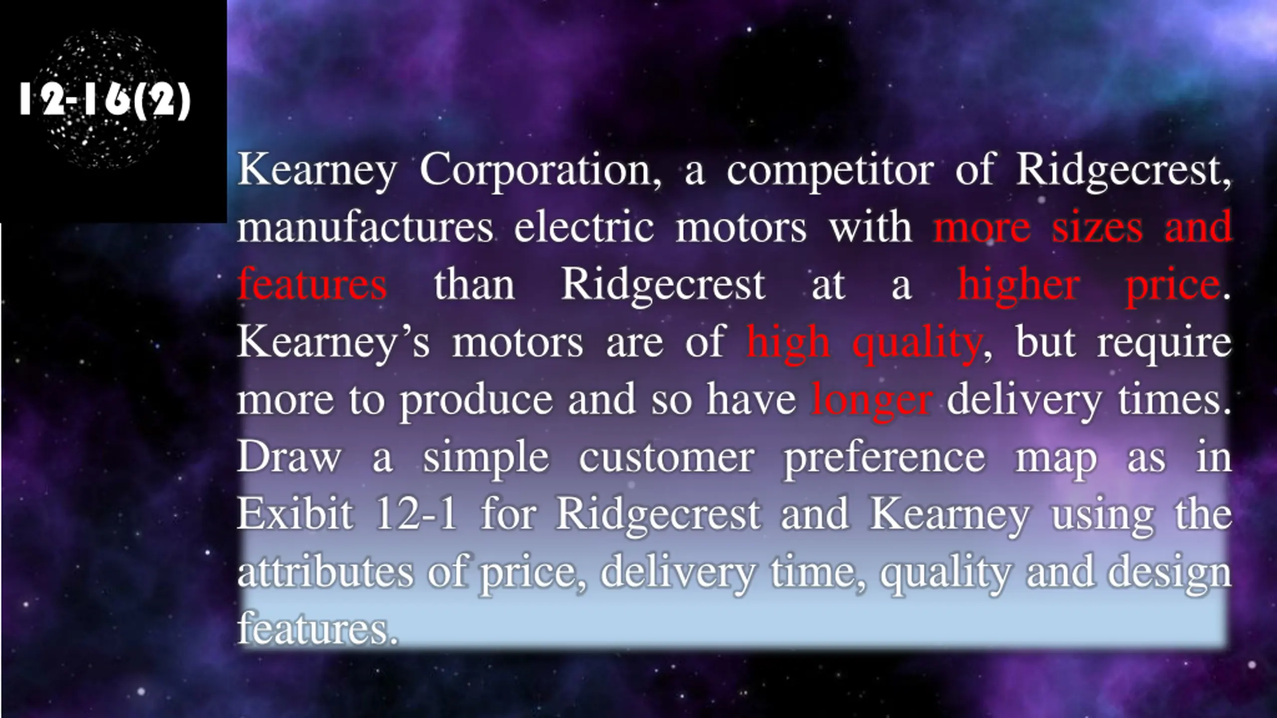 12-16(2) Kearney Corporation, a competitor of Ridgecrest, manufactures electric motors with more sizes and features than Ridgecrest Kearney s motors are of high quality, but require more to produce and so have longer delivery times. Draw a simple customer preference map as in Exibit 12-1 for Ridgecrest and Kearney using the attributes of price, delivery time, quality and design features. at a higher price.