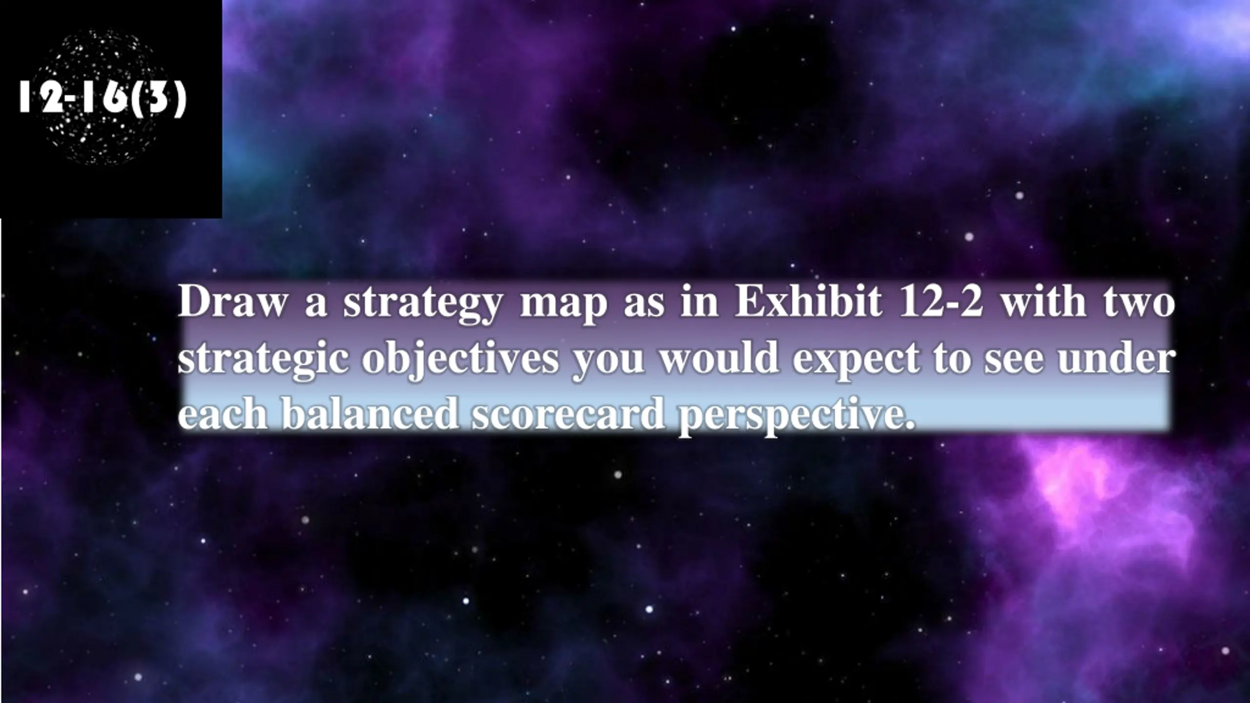 12-16(3) Draw a strategy map as in Exhibit 12-2 with two strategic objectives you would expect to see under each balanced scorecard perspective.