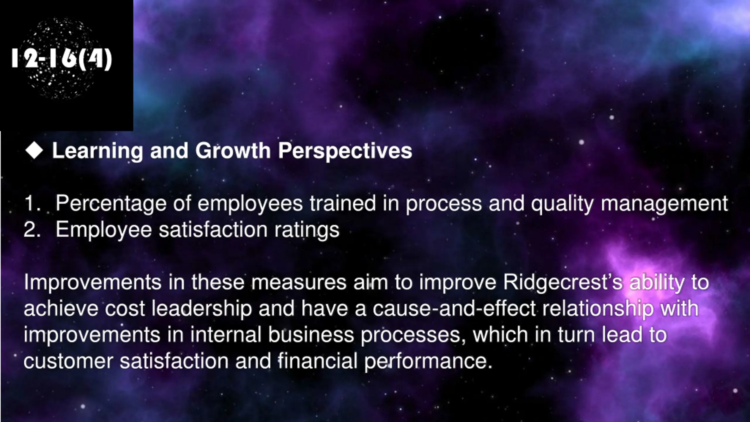 12-16(4) Learning and Growth Perspectives 1. Percentage of employees trained in process and quality management 2. Employee satisfaction ratings Improvements in these measures aim to improve Ridgecrest s ability to achieve cost leadership and have a cause-and-effect relationship with improvements in internal business processes, which in turn lead to customer satisfaction and financial performance.