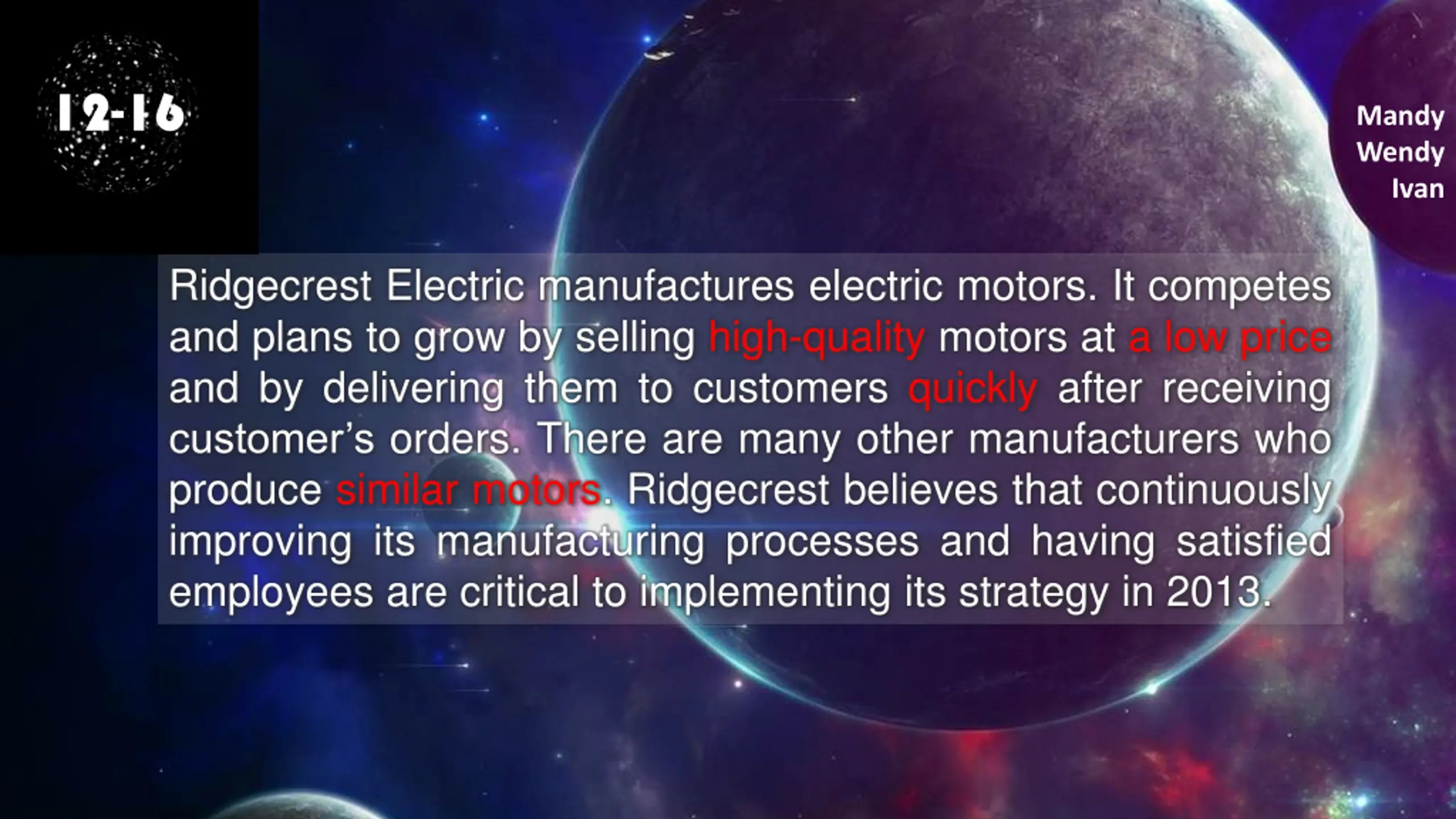 12-16 Mandy Wendy Ivan Ridgecrest Electric manufactures electric motors. It competes and plans to grow by selling high-quality motors at a low price and by delivering them to customers quickly after receiving customer s orders. There are many other manufacturers who produce similar motors. Ridgecrest believes that continuously improving its manufacturing processes and having satisfied employees are critical to implementing its strategy in 2013.