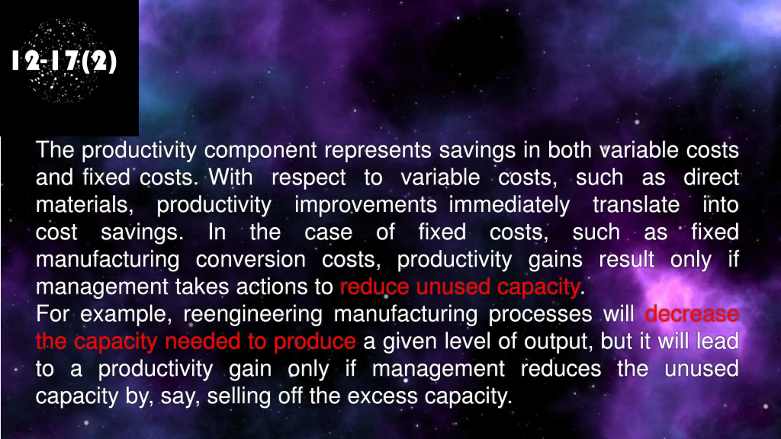 12-17(2) The productivity component represents savings in both variable costs and fixed costs. With respect to variable costs, such as direct materials, productivity improvements immediately cost savings. In the case of manufacturing conversion costs, productivity gains result only if management takes actions to reduce unused capacity. For example, reengineering manufacturing processes will decrease the capacity needed to produce a given level of output, but it will lead to a productivity gain only if management reduces the unused capacity by, say, selling off the excess capacity. translate such into fixed fixed costs, as
