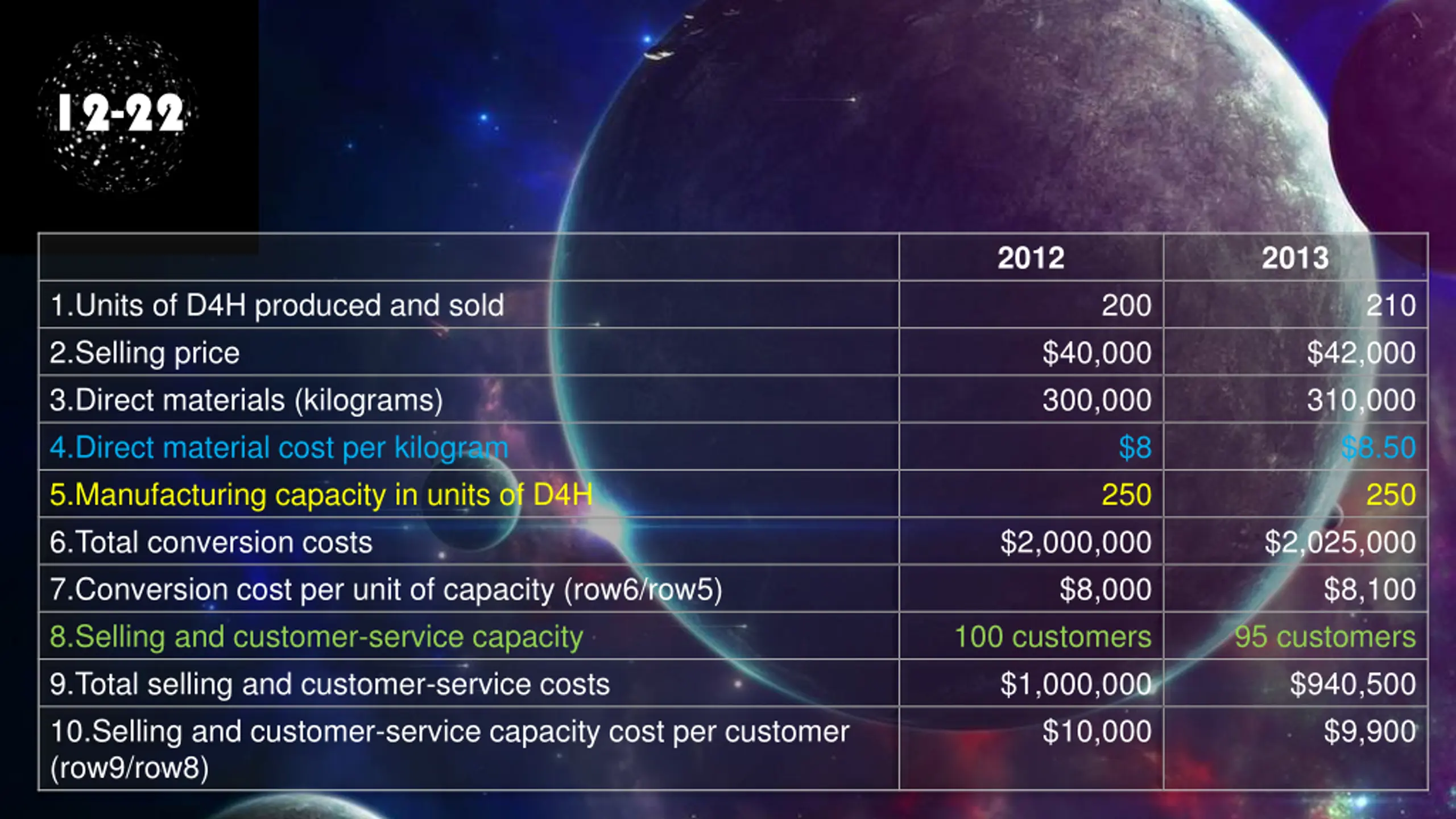 12-22 2012 2013 1.Units of D4H produced and sold 2.Selling price 3.Direct materials (kilograms) 4.Direct material cost per kilogram 5.Manufacturing capacity in units of D4H 6.Total conversion costs 7.Conversion cost per unit of capacity (row6/row5) 8.Selling and customer-service capacity 9.Total selling and customer-service costs 10.Selling and customer-service capacity cost per customer (row9/row8) 200 210 $40,000 300,000 $8 250 $2,000,000 $8,000 100 customers $1,000,000 $10,000 $42,000 310,000 $8.50 250 $2,025,000 $8,100 95 customers $940,500 $9,900