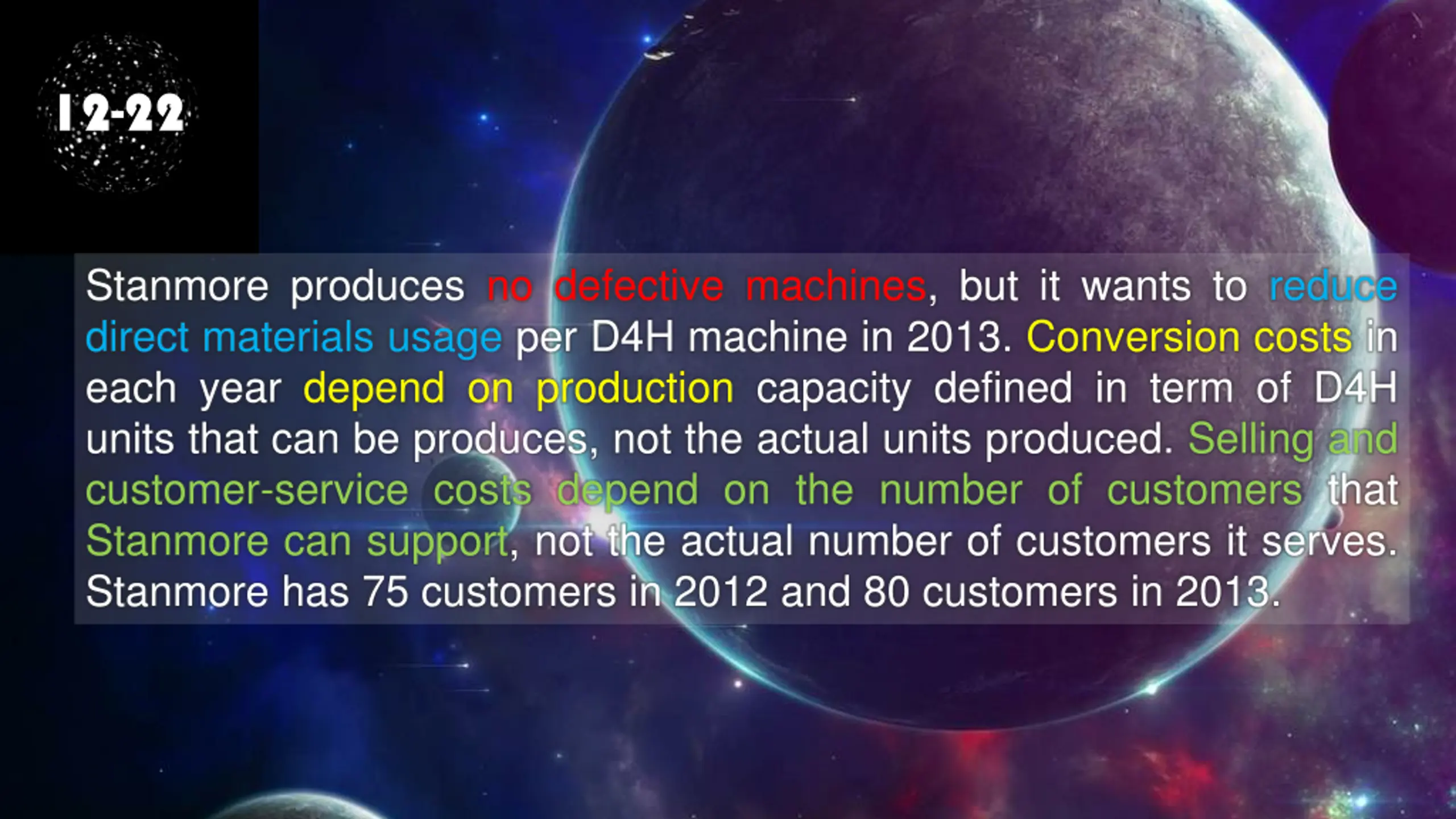 12-22 Stanmore produces no defective machines, but it wants to reduce direct materials usage per D4H machine in 2013. Conversion costs in each year depend on production capacity defined in term of D4H units that can be produces, not the actual units produced. Selling and customer-service costs depend on the number of customers that Stanmore can support, not the actual number of customers it serves. Stanmore has 75 customers in 2012 and 80 customers in 2013.