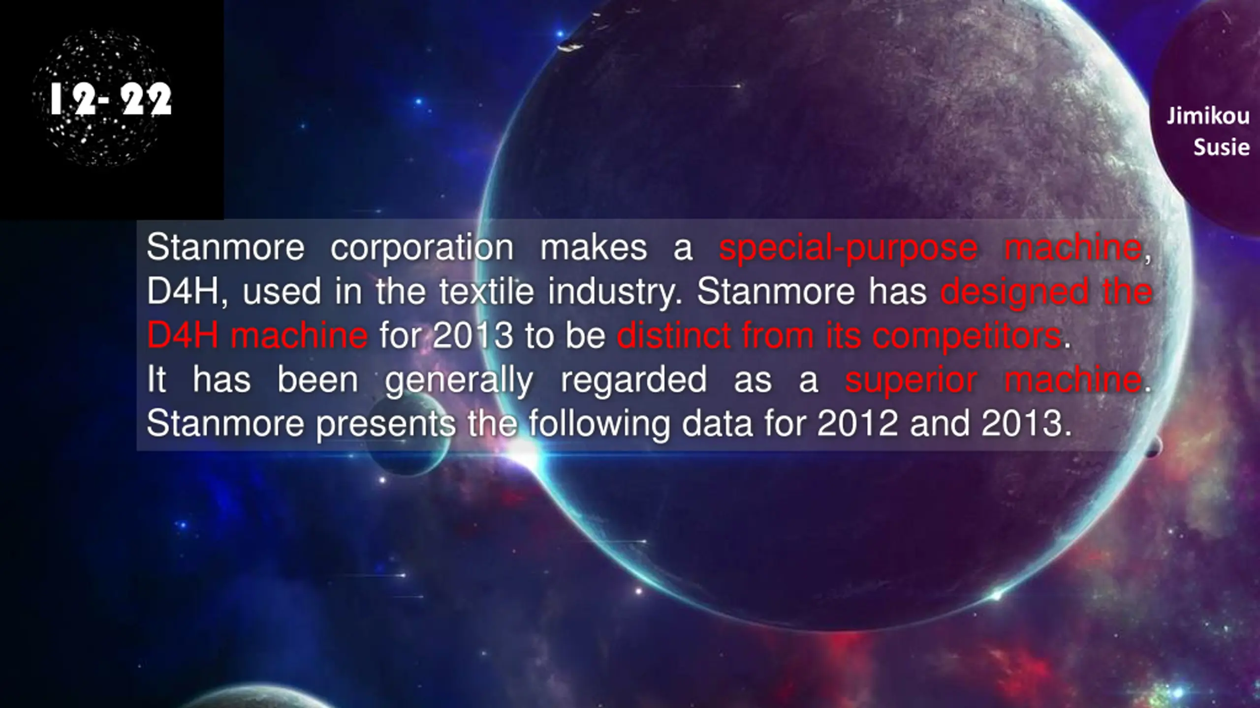 12- 22 Jimikou Susie Stanmore corporation makes a special-purpose machine, D4H, used in the textile industry. Stanmore has designed the D4H machine for 2013 to be distinct from its competitors. It has been generally regarded as a superior machine. Stanmore presents the following data for 2012 and 2013.