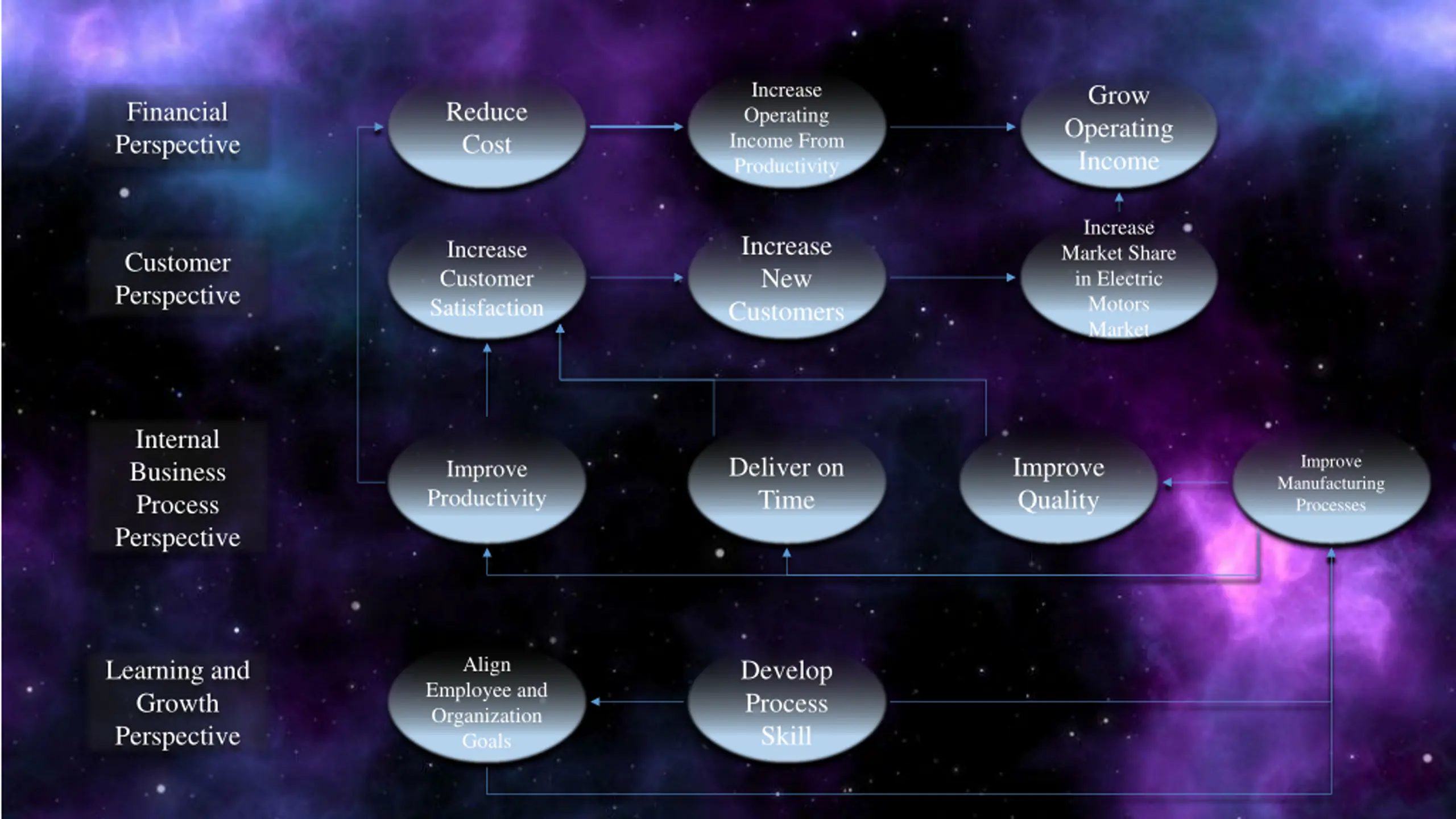 Increase Operating Income From Productivity Grow Operating Income Financial Perspective Reduce Cost Increase Market Share in Electric Motors Market Increase New Customers Increase Customer Satisfaction Customer Perspective Internal Business Process Perspective Improve Manufacturing Processes Deliver on Time Improve Quality Improve Productivity Align Learning and Growth Perspective Develop Process Skill Employee and Organization Goals