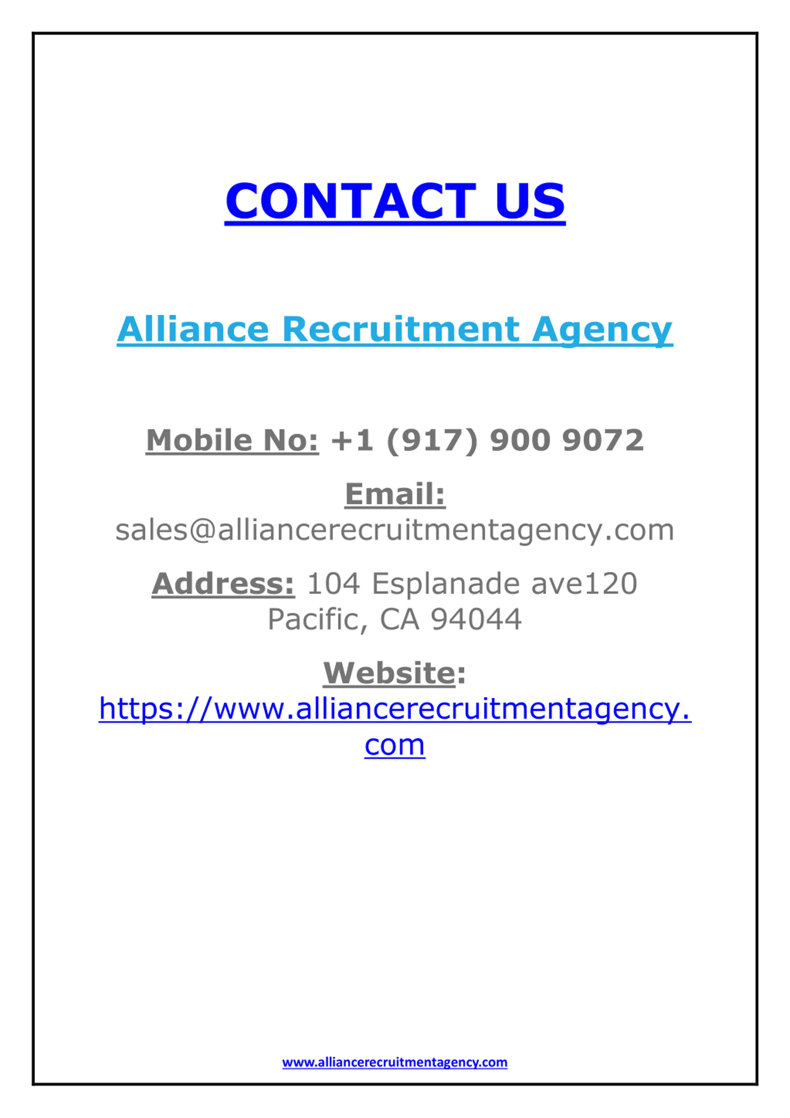 CONTACT US Alliance Recruitment Agency Mobile No: +1 (917) 900 9072 Email: sales@alliancerecruitmentagency.com Address: 104 Esplanade ave120 Pacific, CA 94044 Website: https://www.alliancerecruitmentagency. com www.alliancerecruitmentagency.com