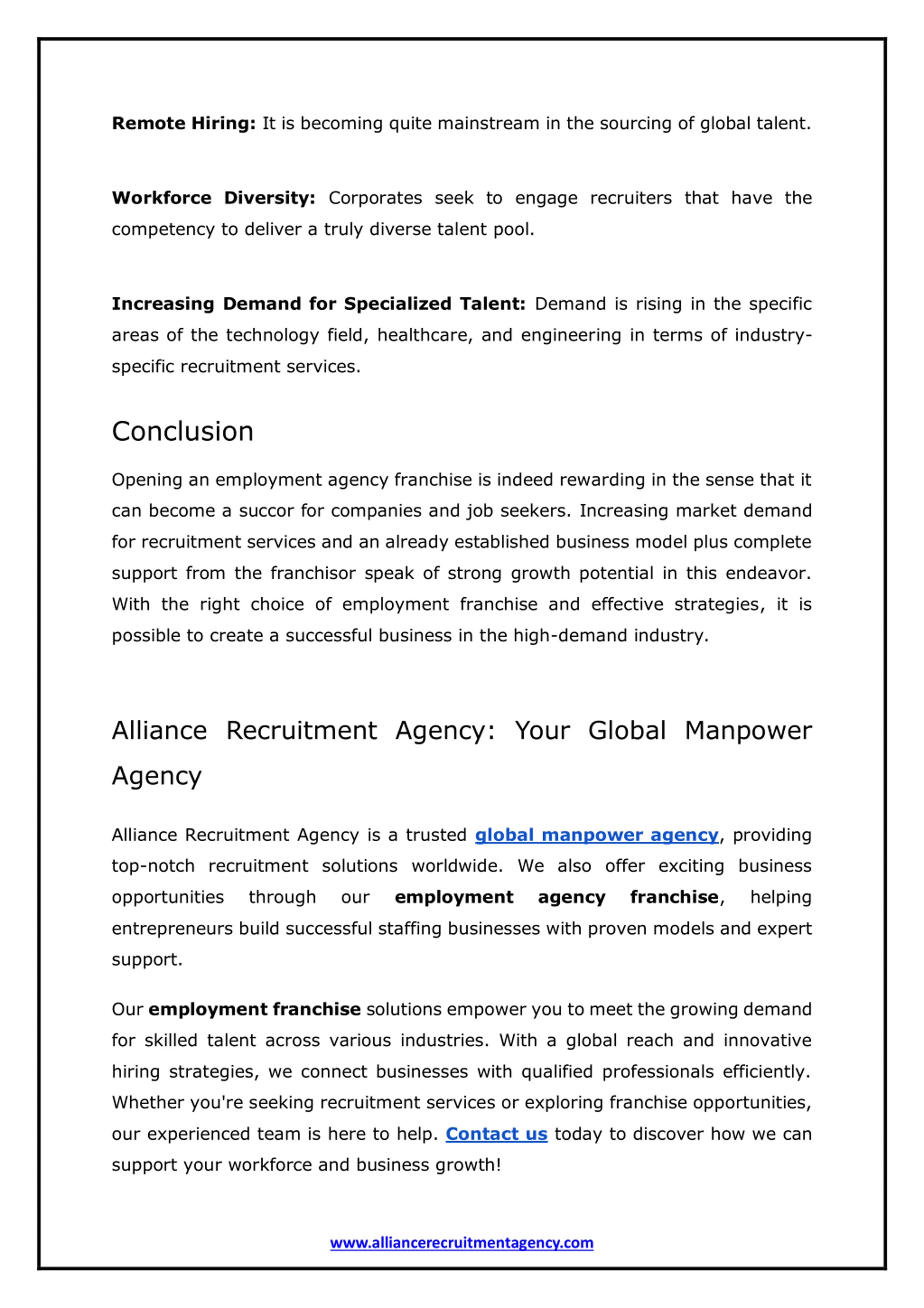 Remote Hiring: It is becoming quite mainstream in the sourcing of global talent. Workforce Diversity: Corporates seek to engage recruiters that have the competency to deliver a truly diverse talent pool. Increasing Demand for Specialized Talent: Demand is rising in the specific areas of the technology field, healthcare, and engineering in terms of industry- specific recruitment services. Conclusion Opening an employment agency franchise is indeed rewarding in the sense that it can become a succor for companies and job seekers. Increasing market demand for recruitment services and an already established business model plus complete support from the franchisor speak of strong growth potential in this endeavor. With the right choice of employment franchise and effective strategies, it is possible to create a successful business in the high-demand industry. Alliance Recruitment Agency: Your Global Manpower Agency Alliance Recruitment Agency is a trusted global manpower agency, providing top-notch recruitment solutions worldwide. We also offer exciting business opportunities through our employment agency franchise, helping entrepreneurs build successful staffing businesses with proven models and expert support. Our employment franchise solutions empower you to meet the growing demand for skilled talent across various industries. With a global reach and innovative hiring strategies, we connect businesses with qualified professionals efficiently. Whether you're seeking recruitment services or exploring franchise opportunities, our experienced team is here to help. Contact us today to discover how we can support your workforce and business growth! www.alliancerecruitmentagency.com