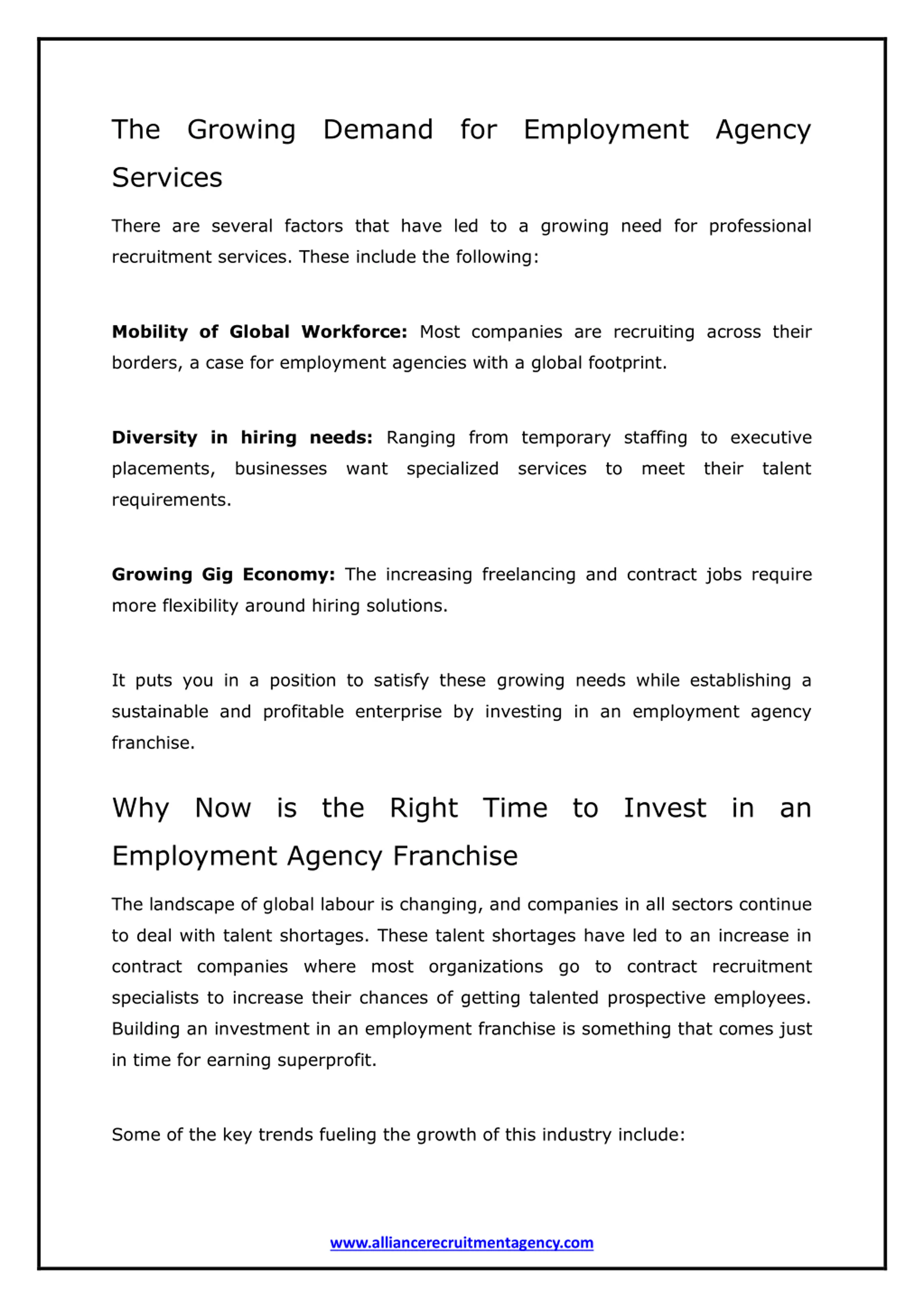 The Growing Demand for Employment Agency Services There are several factors that have led to a growing need for professional recruitment services. These include the following: Mobility of Global Workforce: Most companies are recruiting across their borders, a case for employment agencies with a global footprint. Diversity in hiring needs: Ranging from temporary staffing to executive placements, businesses want specialized services to meet their talent requirements. Growing Gig Economy: The increasing freelancing and contract jobs require more flexibility around hiring solutions. It puts you in a position to satisfy these growing needs while establishing a sustainable and profitable enterprise by investing in an employment agency franchise. Why Now is the Right Time to Invest in an Employment Agency Franchise The landscape of global labour is changing, and companies in all sectors continue to deal with talent shortages. These talent shortages have led to an increase in contract companies where most organizations go to contract recruitment specialists to increase their chances of getting talented prospective employees. Building an investment in an employment franchise is something that comes just in time for earning superprofit. Some of the key trends fueling the growth of this industry include: www.alliancerecruitmentagency.com