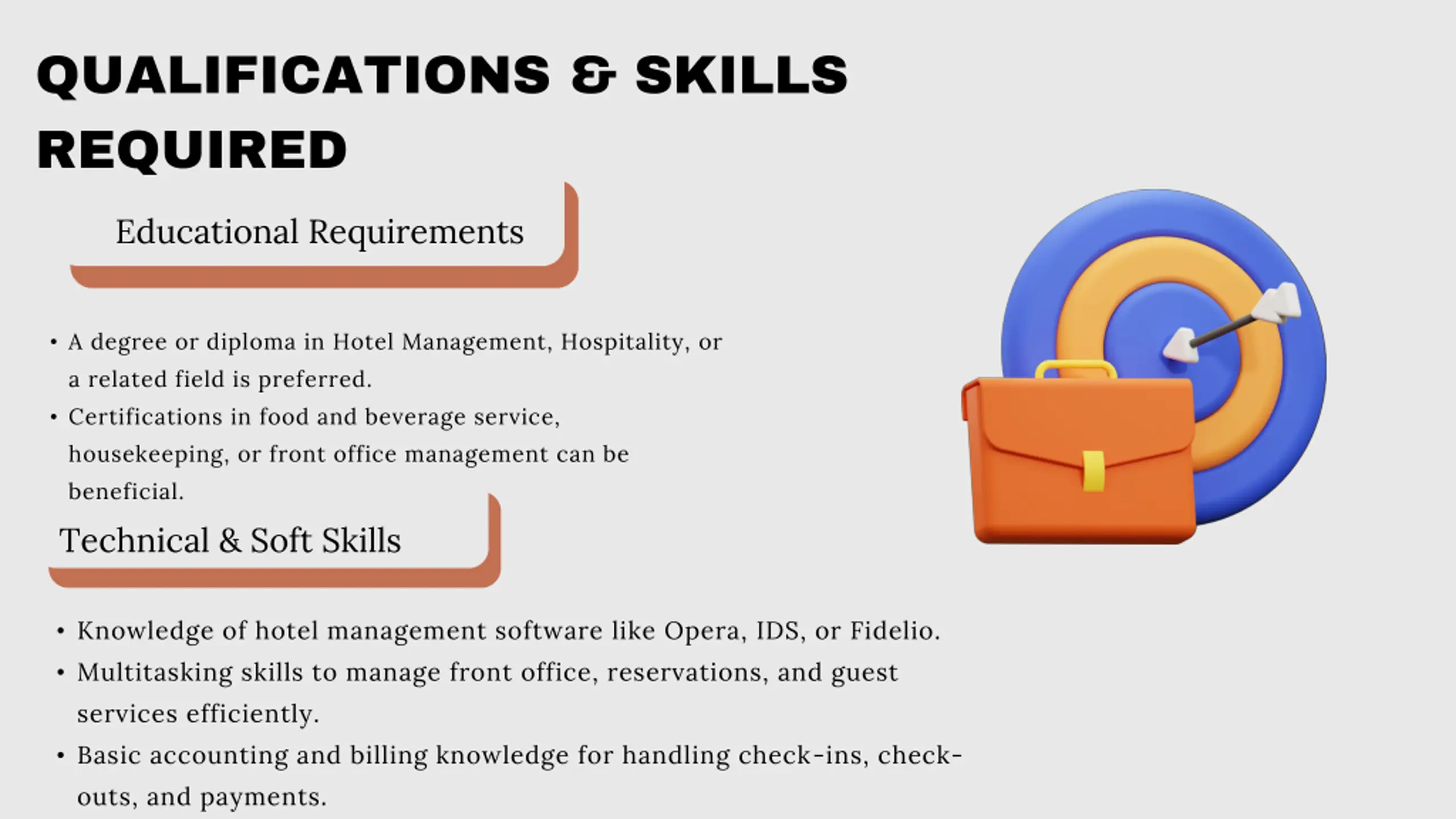 QUALIFICATIONS & SKILLS REQUIRED Educational Requirements A degree or diploma in Hotel Management, Hospitality, or a related field is preferred. Certifications in food and beverage service, housekeeping, or front office management can be beneficial. Technical & Soft Skills Knowledge of hotel management software like Opera, IDS, or Fidelio. Multitasking skills to manage front office, reservations, and guest services efficiently. Basic accounting and billing knowledge for handling check-ins, check- outs, and payments.