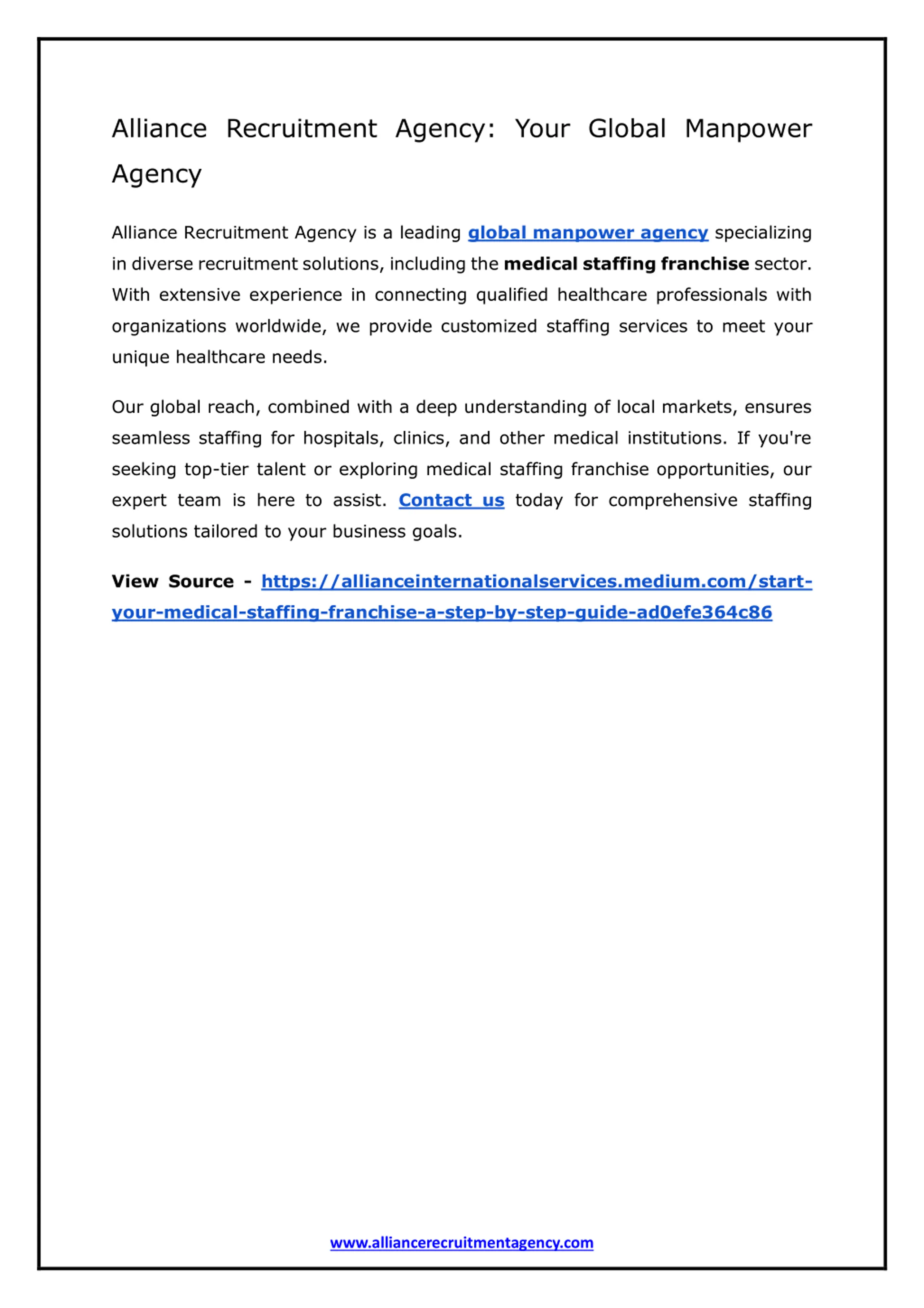 Alliance Recruitment Agency: Your Global Manpower Agency Alliance Recruitment Agency is a leading global manpower agency specializing in diverse recruitment solutions, including the medical staffing franchise sector. With extensive experience in connecting qualified healthcare professionals with organizations worldwide, we provide customized staffing services to meet your unique healthcare needs. Our global reach, combined with a deep understanding of local markets, ensures seamless staffing for hospitals, clinics, and other medical institutions. If you're seeking top-tier talent or exploring medical staffing franchise opportunities, our expert team is here to assist. Contact us today for comprehensive staffing solutions tailored to your business goals. View Source - https://allianceinternationalservices.medium.com/start- your-medical-staffing-franchise-a-step-by-step-guide-ad0efe364c86 www.alliancerecruitmentagency.com