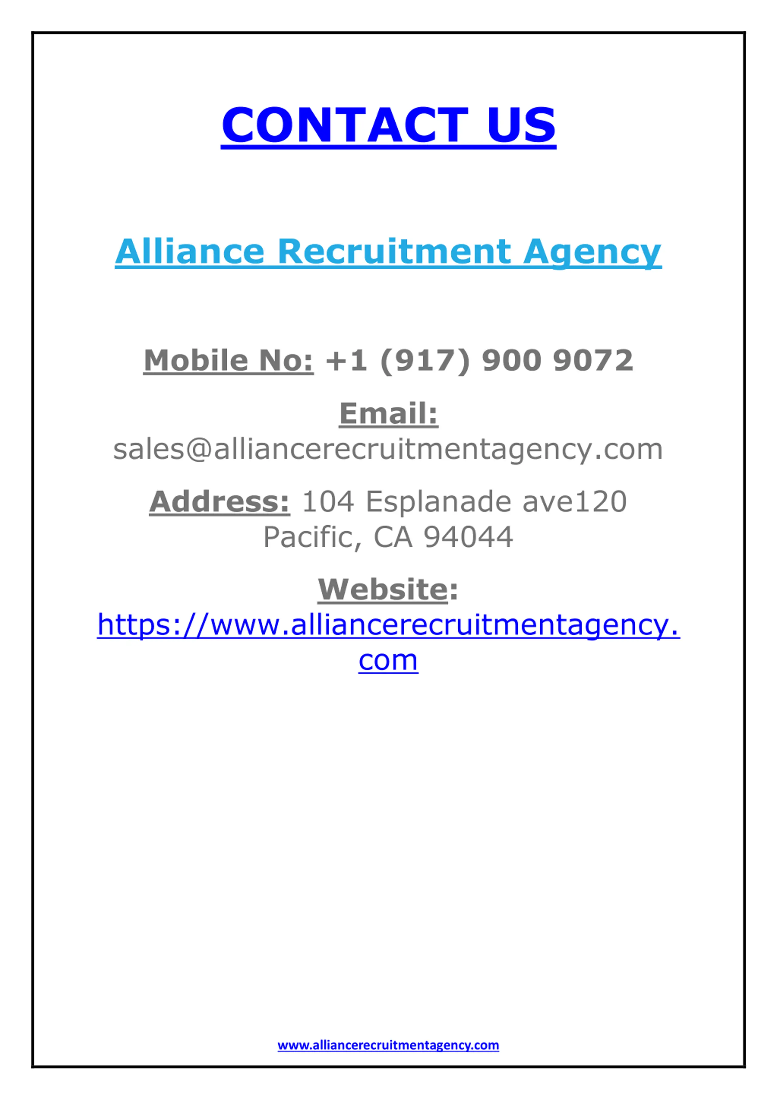 CONTACT US Alliance Recruitment Agency Mobile No: +1 (917) 900 9072 Email: sales@alliancerecruitmentagency.com Address: 104 Esplanade ave120 Pacific, CA 94044 Website: https://www.alliancerecruitmentagency. com www.alliancerecruitmentagency.com