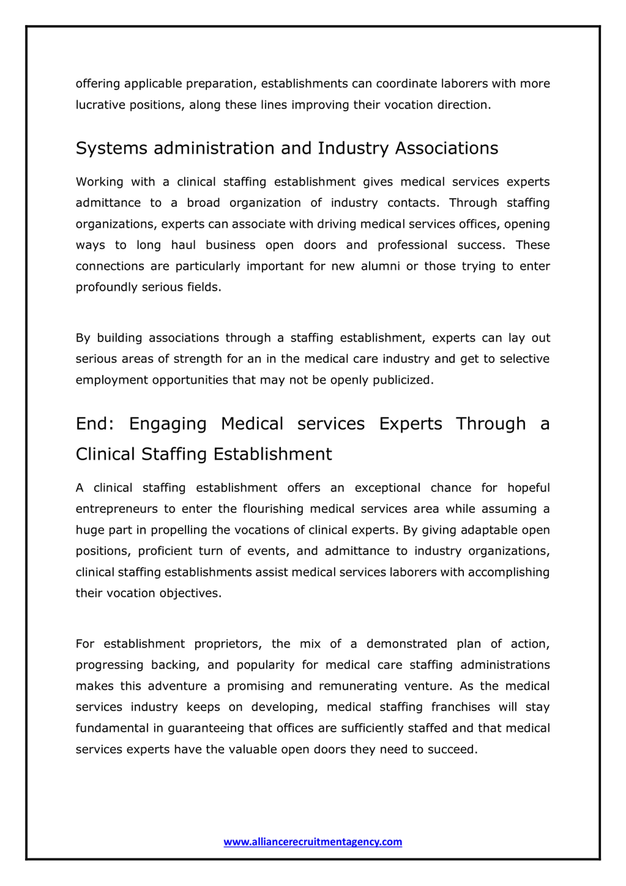 offering applicable preparation, establishments can coordinate laborers with more lucrative positions, along these lines improving their vocation direction. Systems administration and Industry Associations Working with a clinical staffing establishment gives medical services experts admittance to a broad organization of industry contacts. Through staffing organizations, experts can associate with driving medical services offices, opening ways to long haul business open doors and professional success. These connections are particularly important for new alumni or those trying to enter profoundly serious fields. By building associations through a staffing establishment, experts can lay out serious areas of strength for an in the medical care industry and get to selective employment opportunities that may not be openly publicized. End: Engaging Medical services Experts Through a Clinical Staffing Establishment A clinical staffing establishment offers an exceptional chance for hopeful entrepreneurs to enter the flourishing medical services area while assuming a huge part in propelling the vocations of clinical experts. By giving adaptable open positions, proficient turn of events, and admittance to industry organizations, clinical staffing establishments assist medical services laborers with accomplishing their vocation objectives. For establishment proprietors, the mix of a demonstrated plan of action, progressing backing, and popularity for medical care staffing administrations makes this adventure a promising and remunerating venture. As the medical services industry keeps on developing, medical staffing franchises will stay fundamental in guaranteeing that offices are sufficiently staffed and that medical services experts have the valuable open doors they need to succeed. www.alliancerecruitmentagency.com